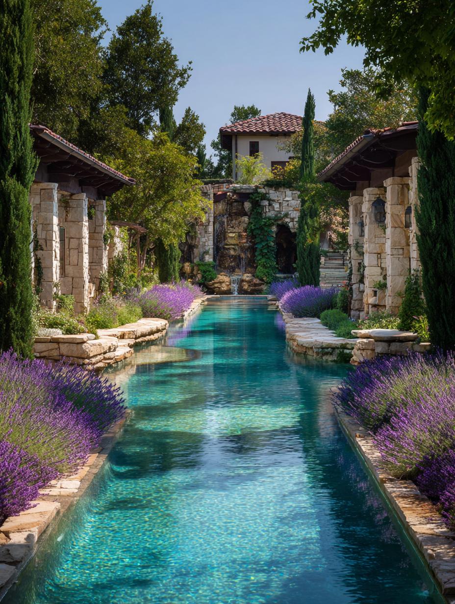 Crystal-clear turquoise water flows through this stunning linear pool design, flanked by perfectly manicured lavender plantings that create aromatic purple borders. Natural limestone coping and weathered stone columns frame the water feature, while tall cypress trees provide vertical drama against the Mediterranean-style architecture. The infinity edge creates seamless flow toward the stone waterfall backdrop, transforming this outdoor space into a resort-worthy sanctuary that celebrates both water and fragrant botanicals.
