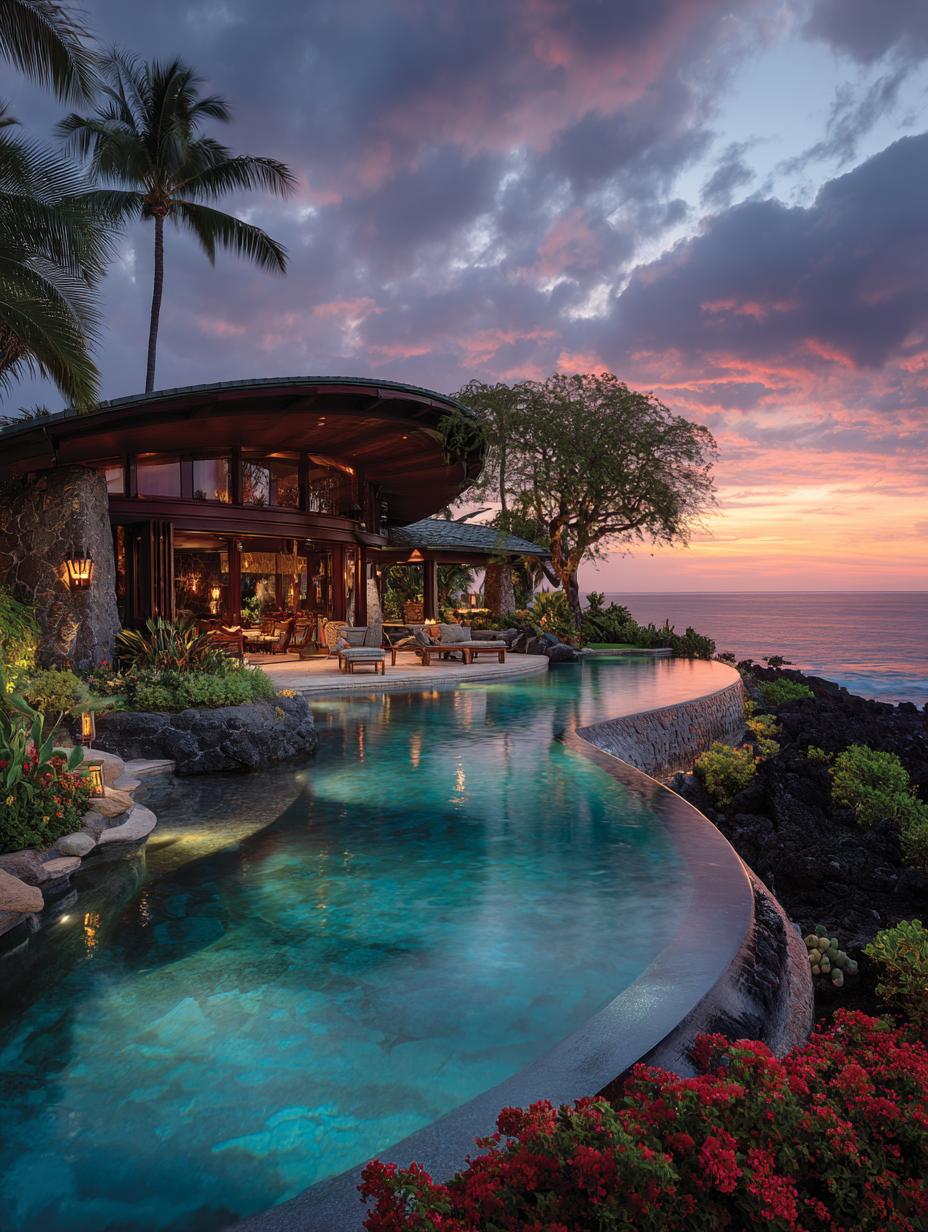 Dramatic volcanic rock formations frame this curved infinity pool that appears to spill directly into the Pacific horizon. Warm interior lighting from the contemporary pavilion reflects across the turquoise water, while native Hawaiian landscaping and mature palm trees create natural privacy. The seamless stone coping and negative edge design maximize the breathtaking sunset views, transforming this outdoor sanctuary into a resort-worthy escape.