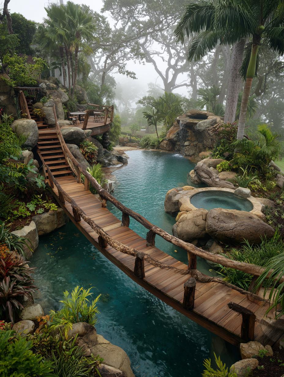 Natural stone boulders frame crystalline turquoise waters while weathered teak boardwalks create dramatic elevated pathways through this resort-style oasis. Palm trees and tropical plantings blur the lines between natural landscape and designed luxury. Misty atmospheric conditions enhance the jungle-like ambiance, transforming an ordinary backyard into an exotic retreat complete with integrated spa features and multi-level wooden decking that winds seamlessly through the aquatic paradise.