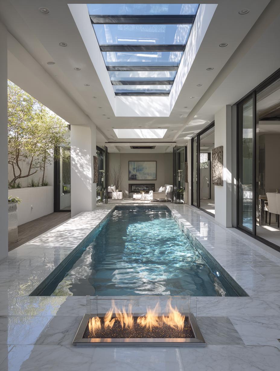 Dramatic skylights flood this enclosed pool pavilion with natural light while floor-to-ceiling glass walls dissolve boundaries between interior and exterior spaces. A sleek rectangular pool commands attention alongside an innovative linear fire feature embedded directly into polished marble flooring. Contemporary furnishings in the adjacent living area complement the minimalist aesthetic, creating an year-round entertaining sanctuary that redefines luxury residential design.