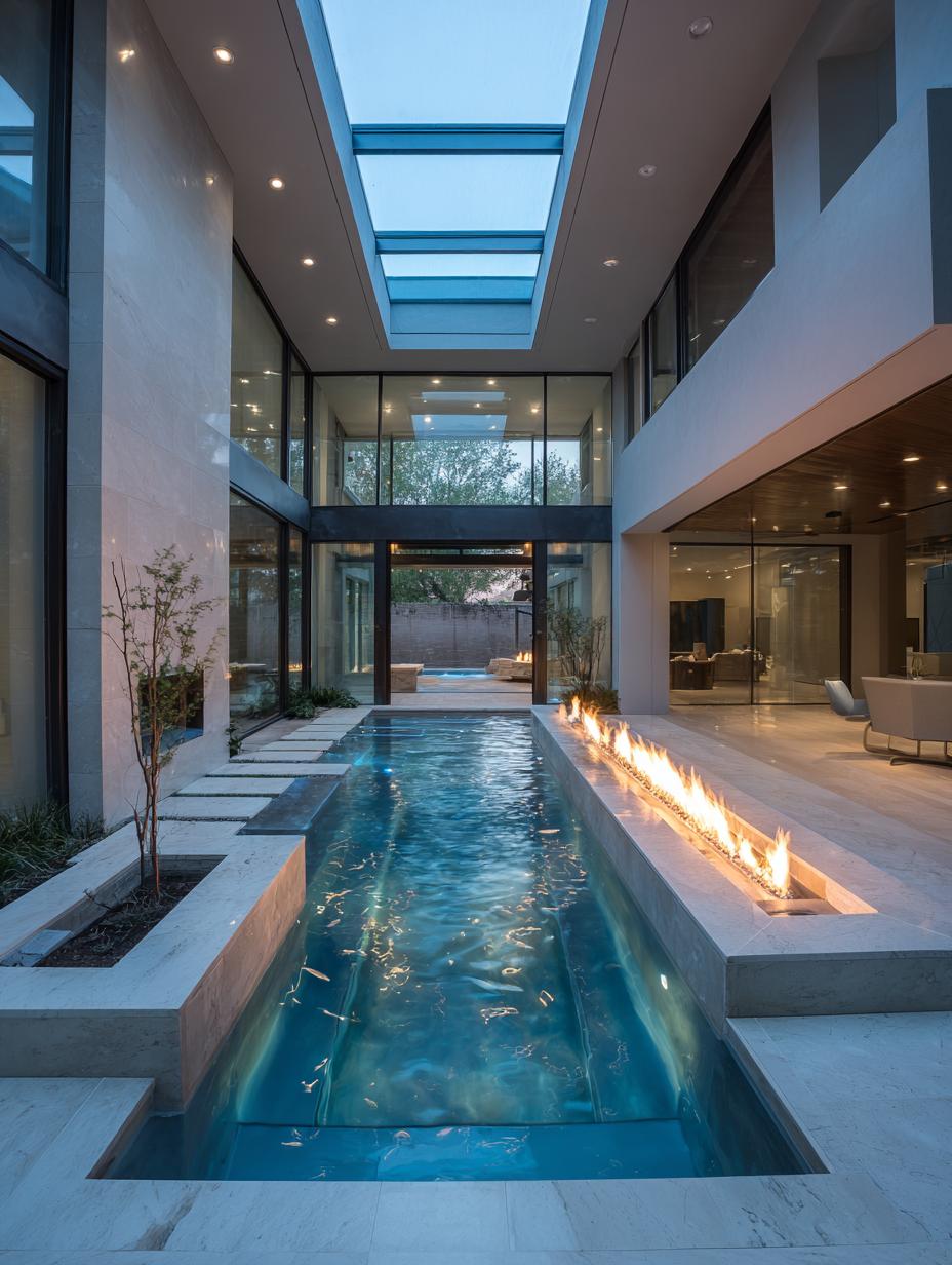 Floor-to-ceiling glass walls dissolve boundaries between interior and exterior spaces while overhead skylights bathe this linear water feature in natural light. Sleek concrete decking frames the narrow pool, which stretches dramatically toward a secondary outdoor pool area. Built-in fire features create ambient warmth along the pool’s edge, while minimalist landscaping and strategic lighting transform this architectural marvel into a year-round entertaining destination.