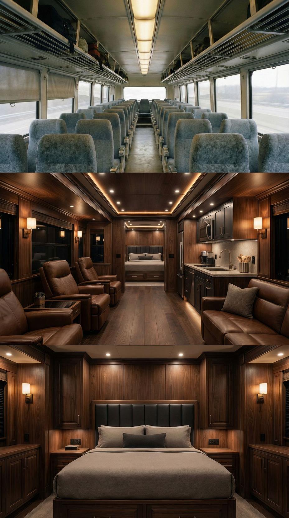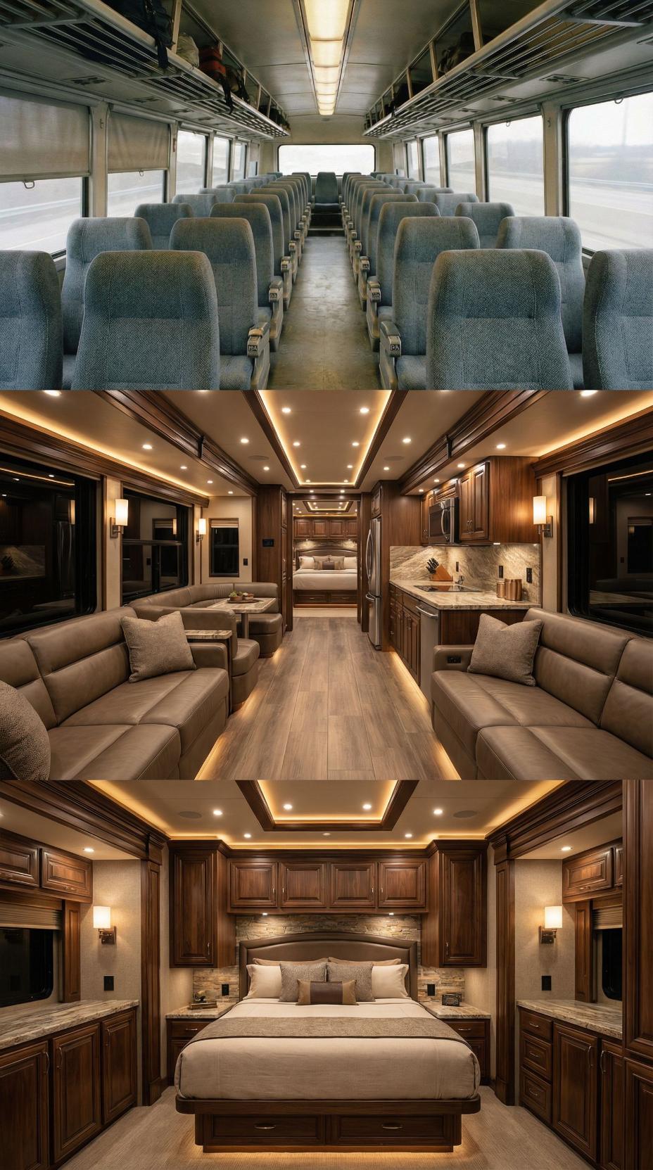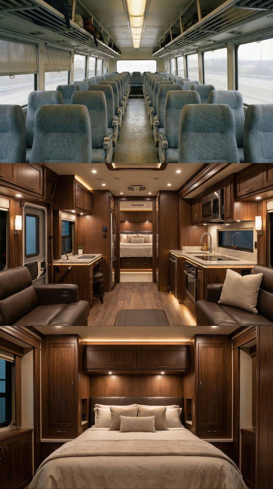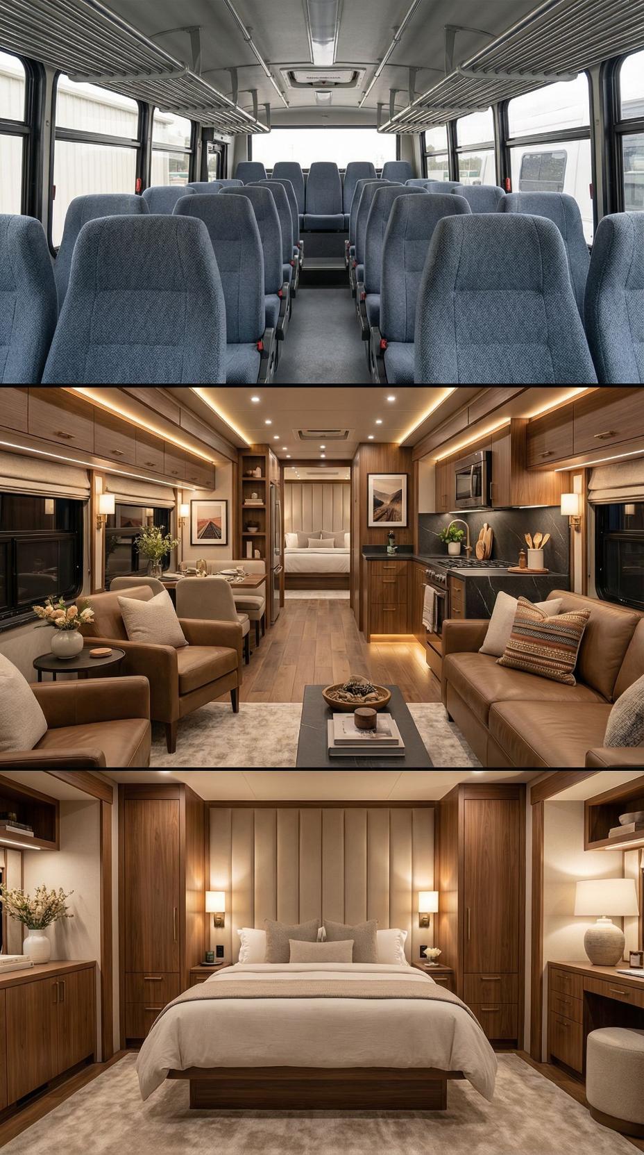 Rows of worn blue fabric bus seats transform into an elegant motorhome featuring rich walnut cabinetry throughout. The conversion showcases a complete galley kitchen with stainless steel appliances, leather seating areas, and a private bedroom suite. Recessed lighting and neutral upholstery create a sophisticated atmosphere that rivals high-end hotels while maintaining efficient use of space.