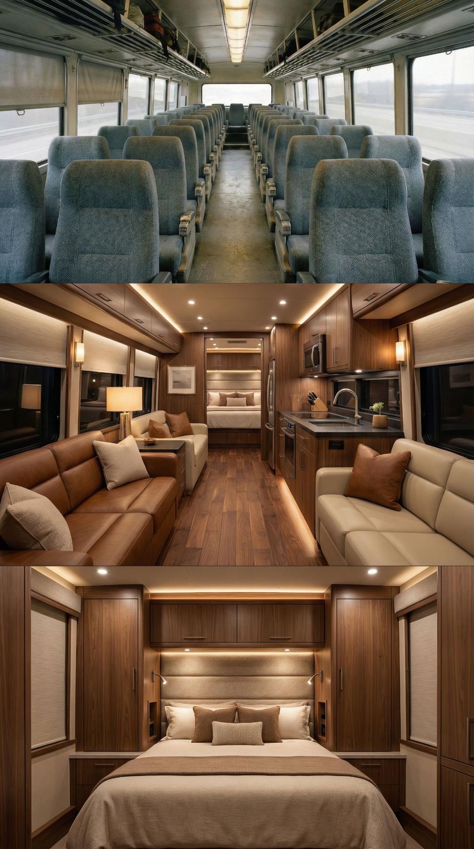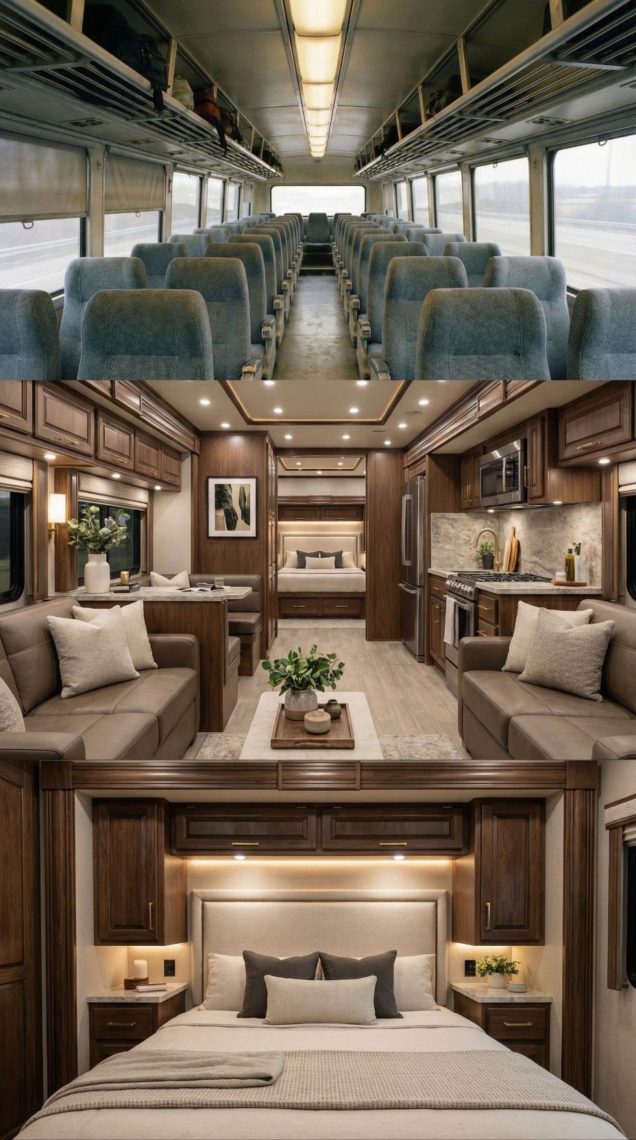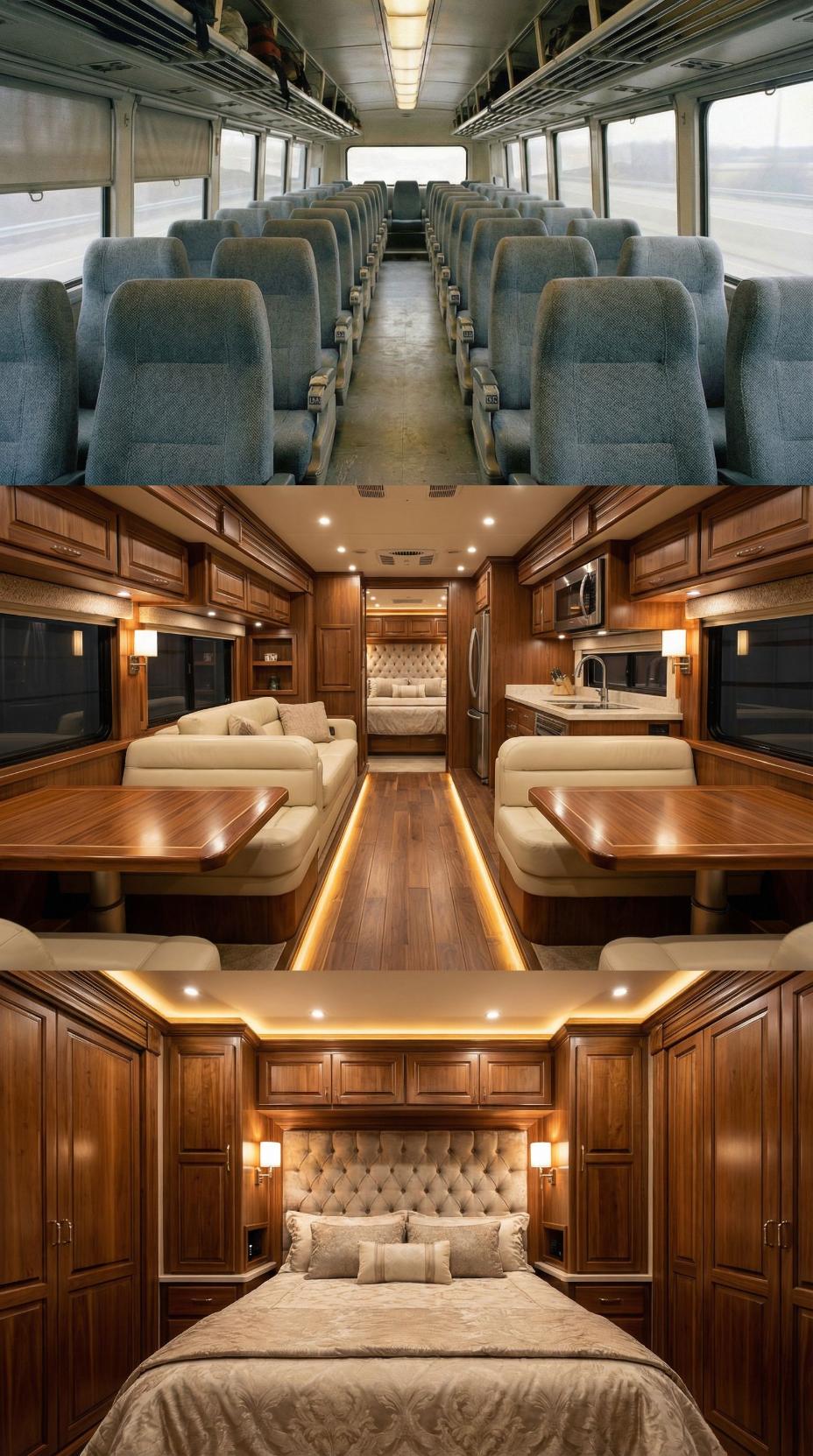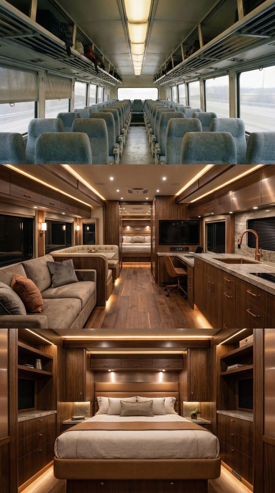Rows of worn blue fabric bus seats transform into an elegant motorhome featuring rich walnut cabinetry throughout. The conversion showcases a complete galley kitchen with stainless steel appliances, leather seating areas, and a private bedroom suite. Recessed lighting and neutral upholstery create a sophisticated atmosphere that rivals high-end hotels while maintaining efficient use of space.