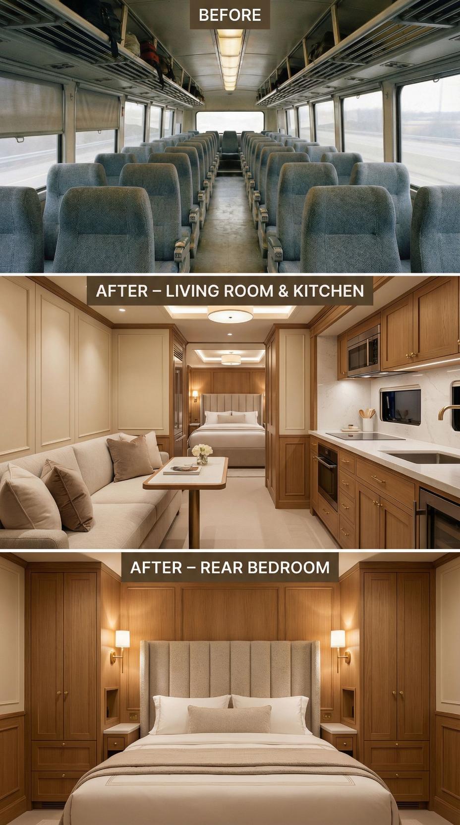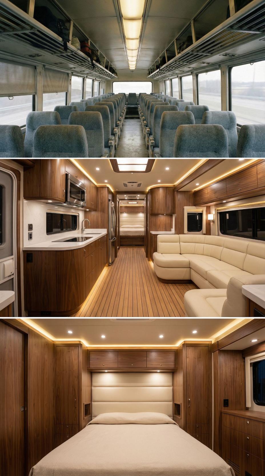 Worn vinyl bench seats and sterile fluorescent lighting vanish beneath warm walnut cabinetry and sophisticated neutral furnishings. Custom millwork frames every surface while recessed LED strips create ambient warmth throughout the reimagined space. Plush sectional seating replaces cramped rows, while a fully equipped galley kitchen and private bedroom suite transform basic transportation into luxurious mobile accommodation.