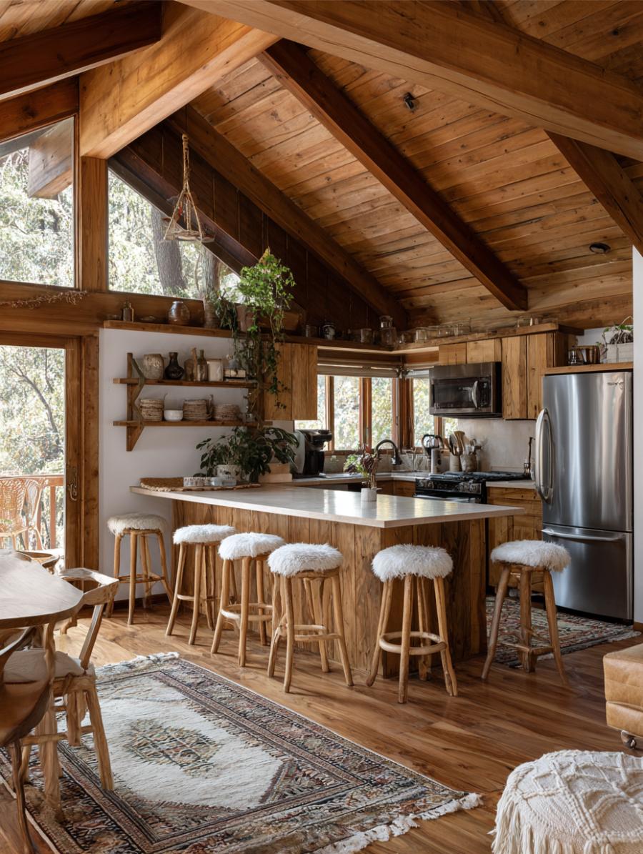 Family Treehouse Kitchen with Island Seating and Forest Views