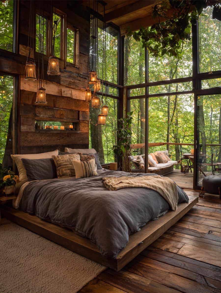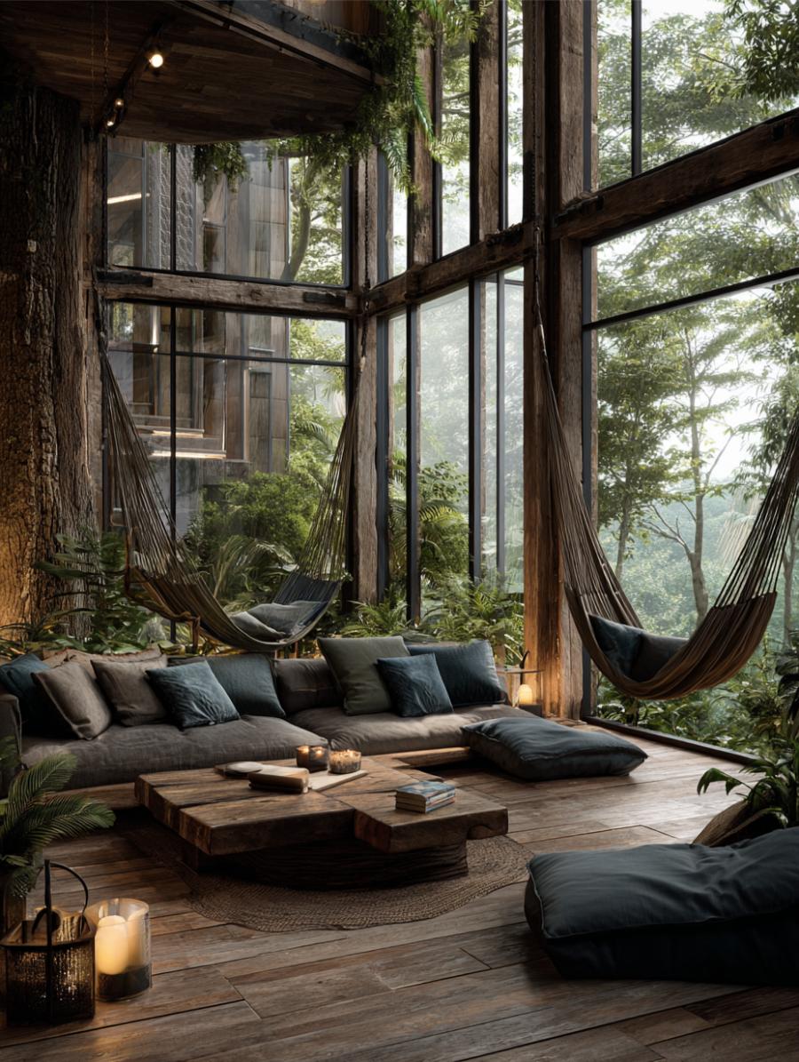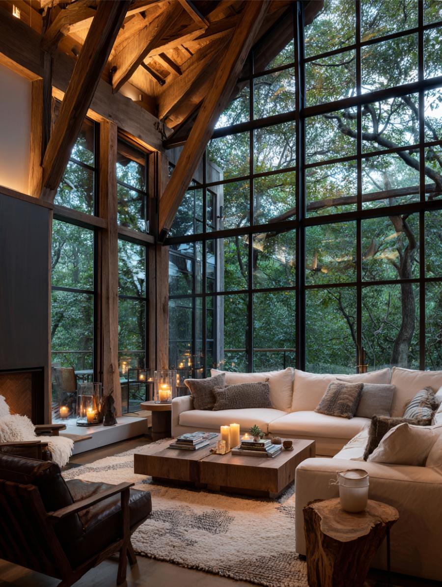 Cozy Modern Treehouse Lounge with Floor-to-Ceiling Glass