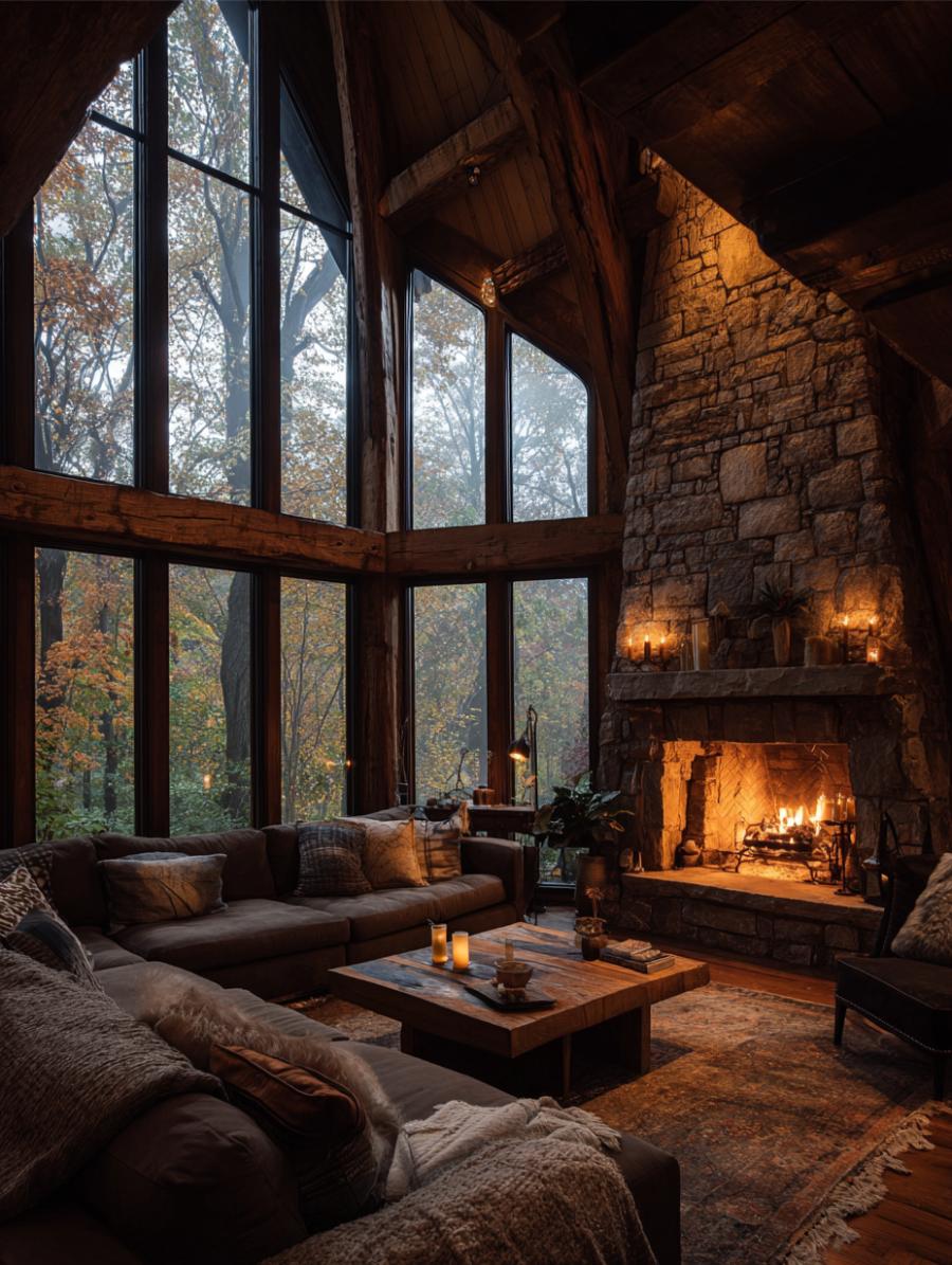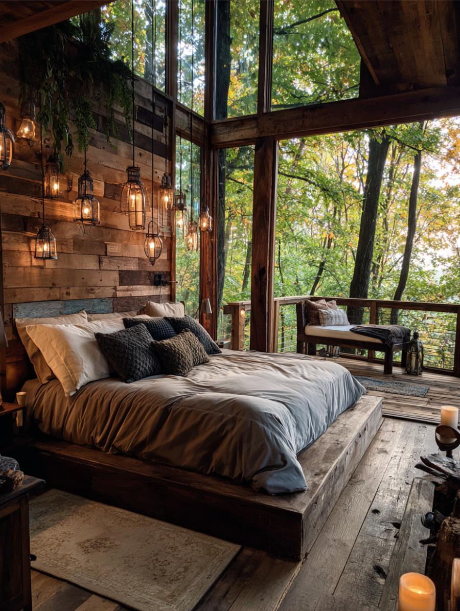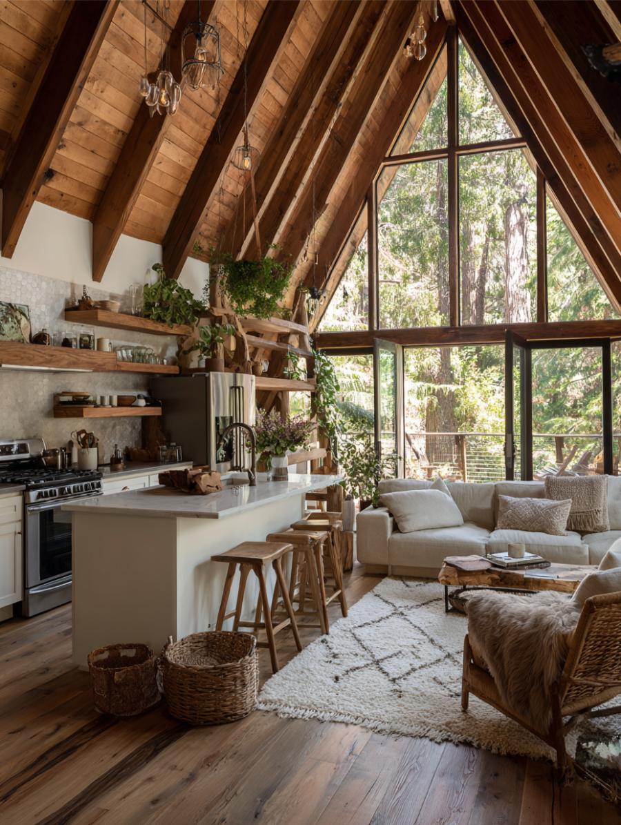 Cozy Modern Treehouse Lounge with Floor-to-Ceiling Glass