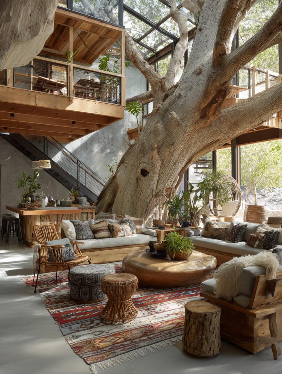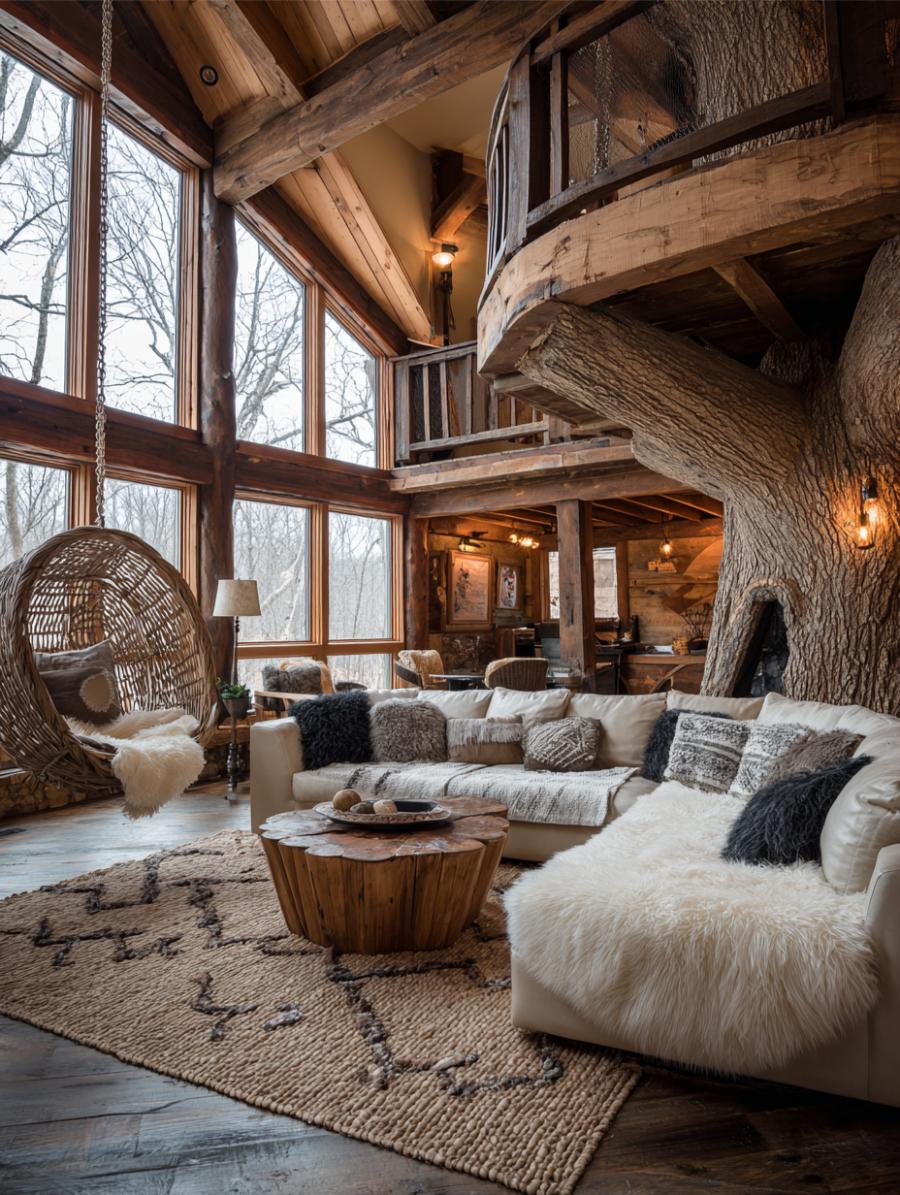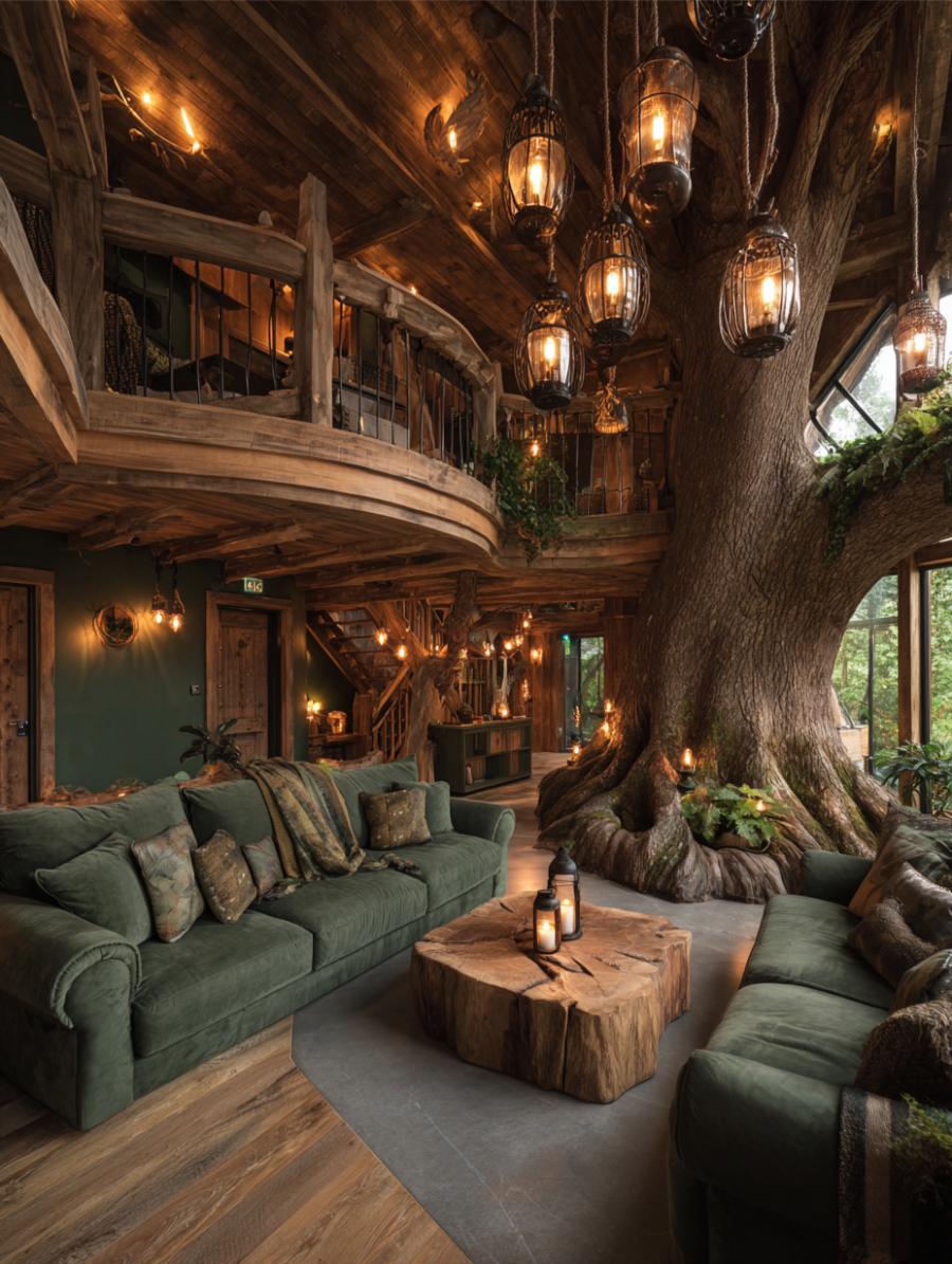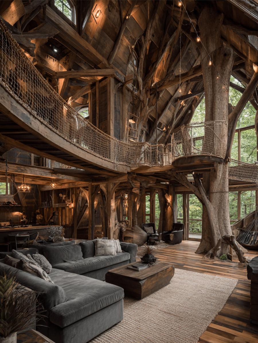 Multi-Room Treehouse Interior with Open Family Gathering Zone