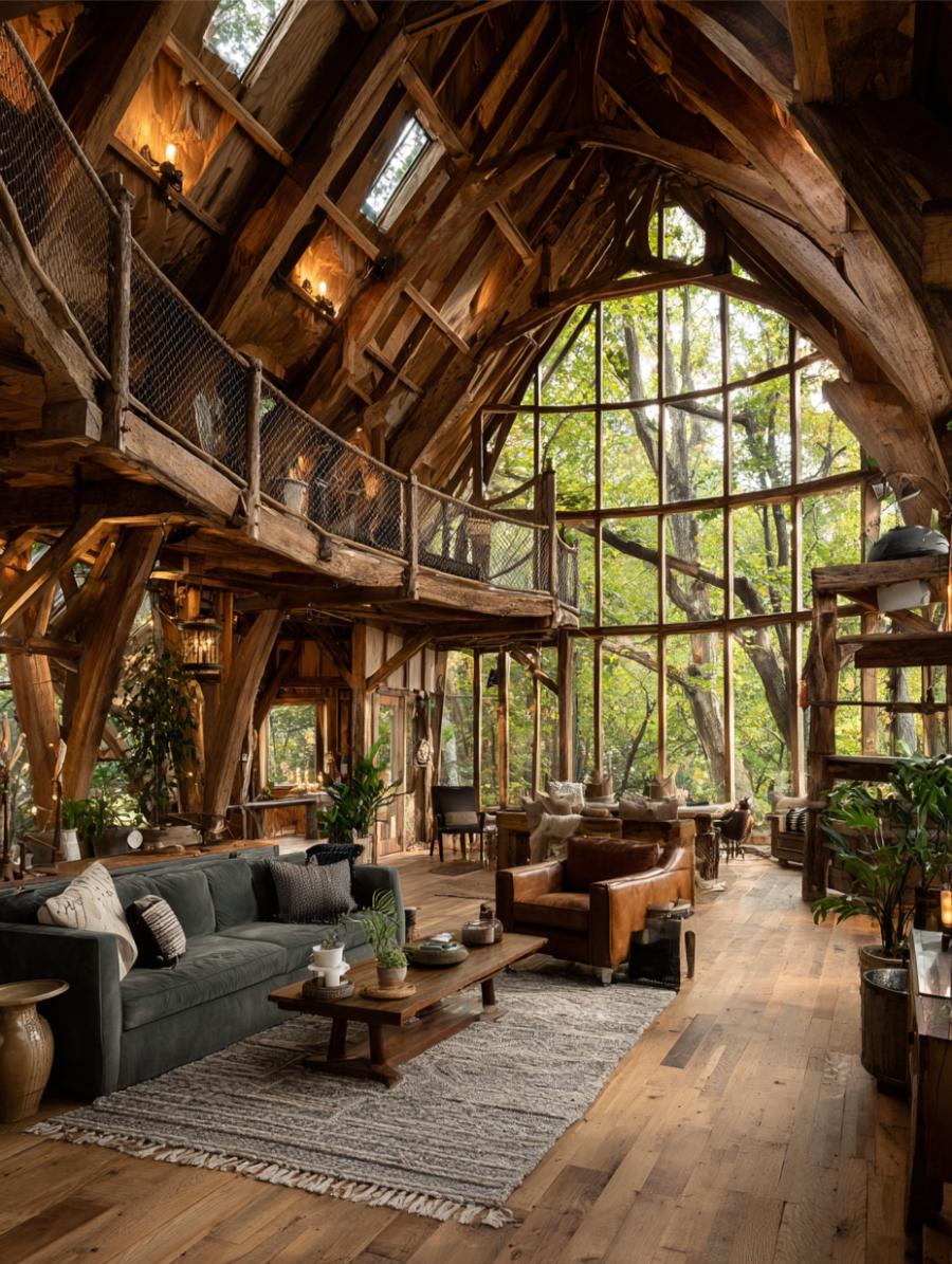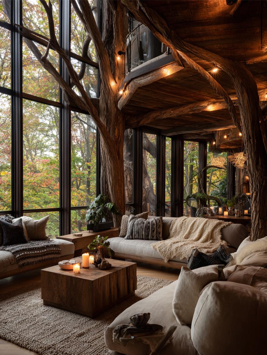 Luxury Treehouse Living Room with Cozy Lounge and Forest Panorama