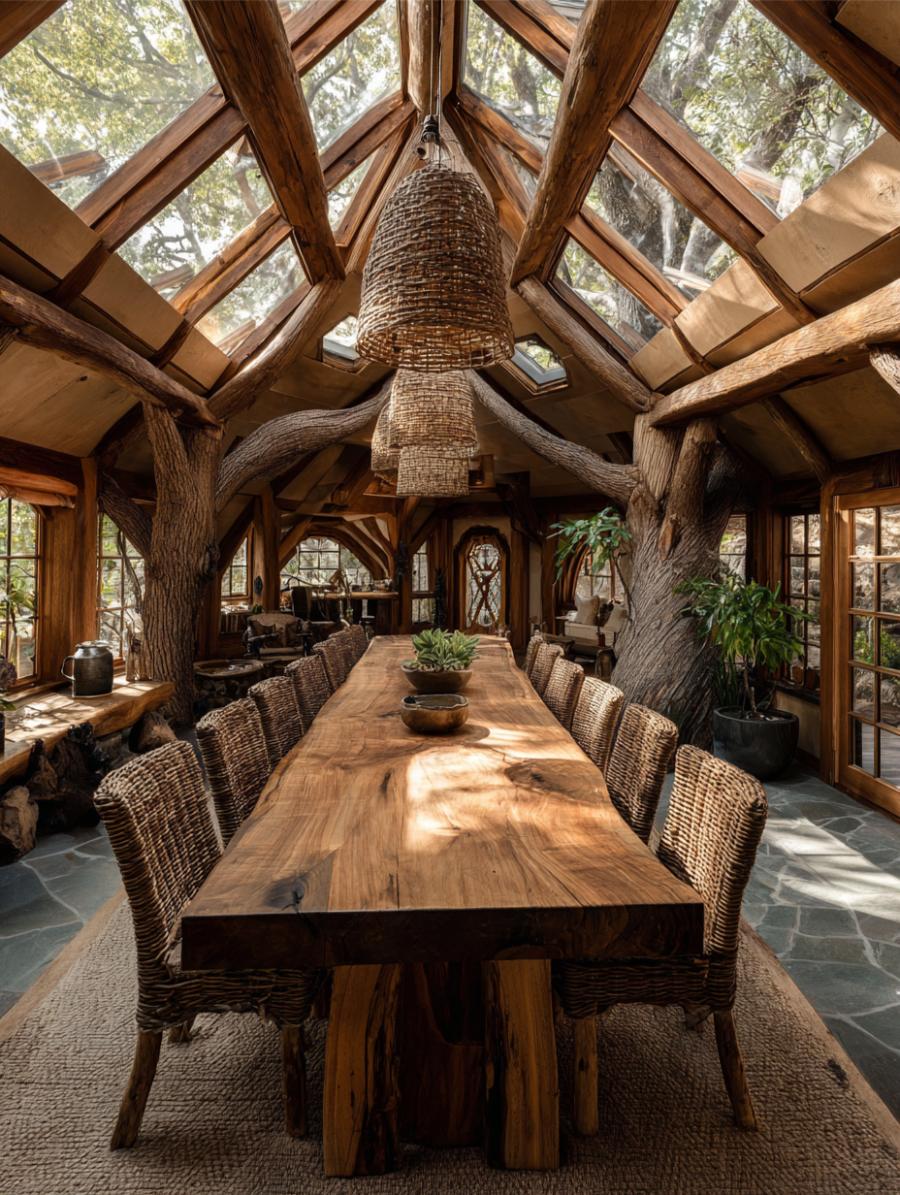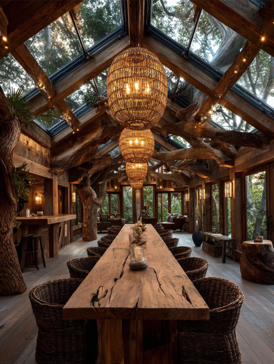 Luxury Treehouse Dining Room with Long Farmhouse Table
