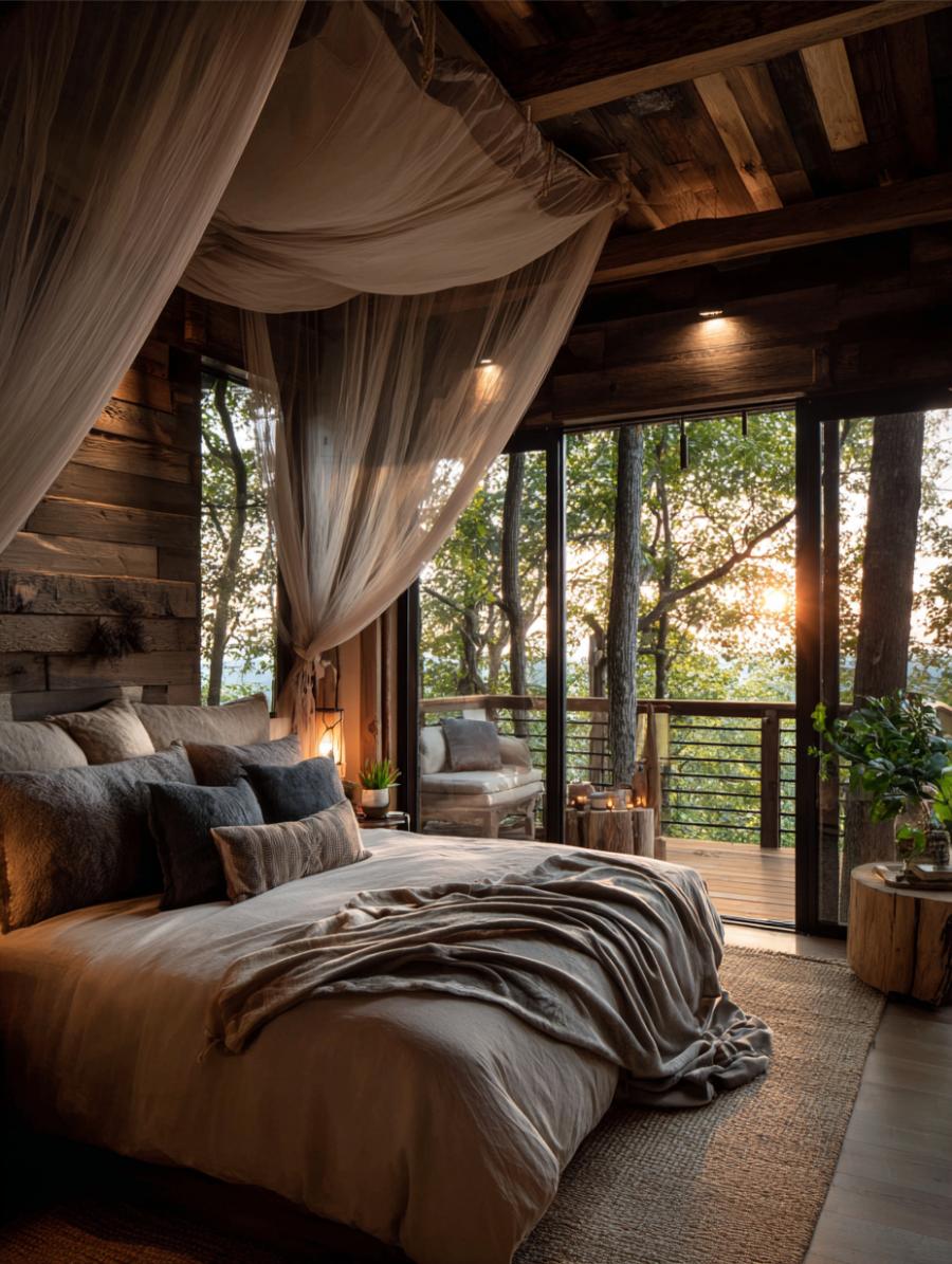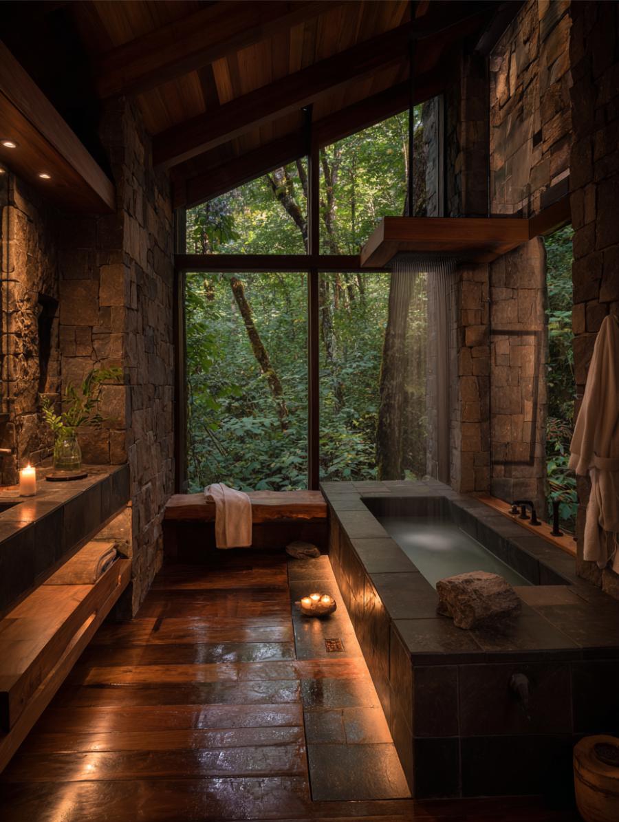 This spa-like treehouse bathroom elevates bathing into a true ritual. A deep soaking tub is oriented to drink in treetop views, turning the forest into a living mural. Natural stone, wood, and soft lighting make the room feel like a high-end spa carved into the branches. It is the kind of retreat where you lose track of time soaking above the ground.