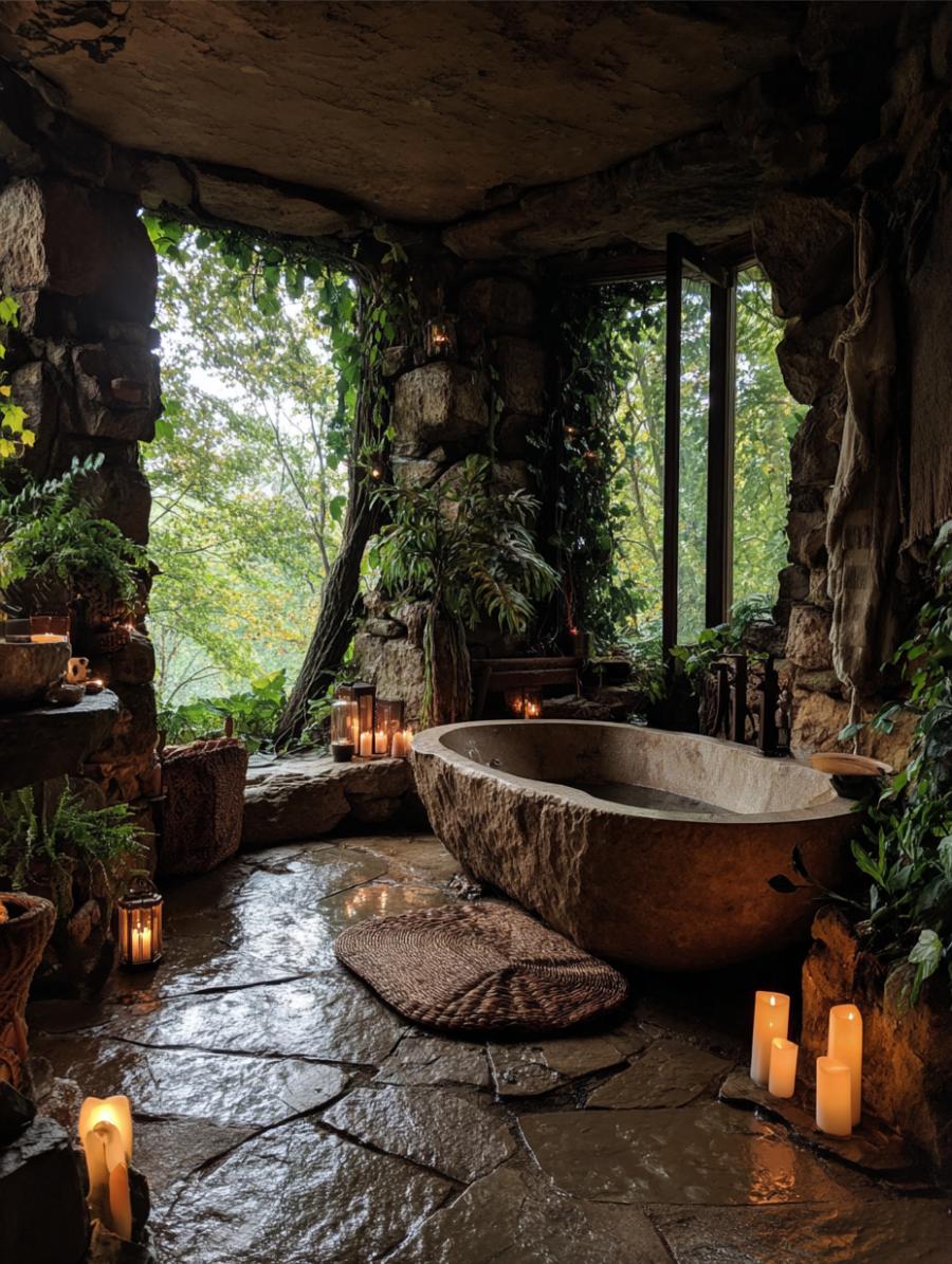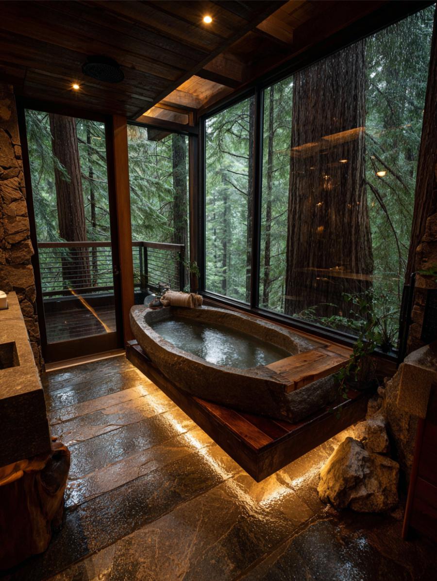 Treehouse Bath with Freestanding Stone Tub and Forest Outlook