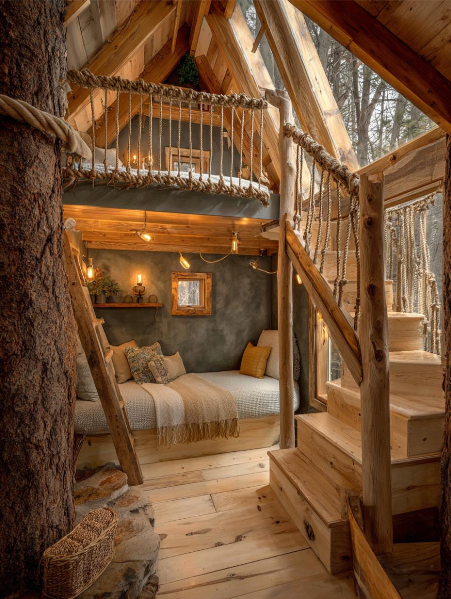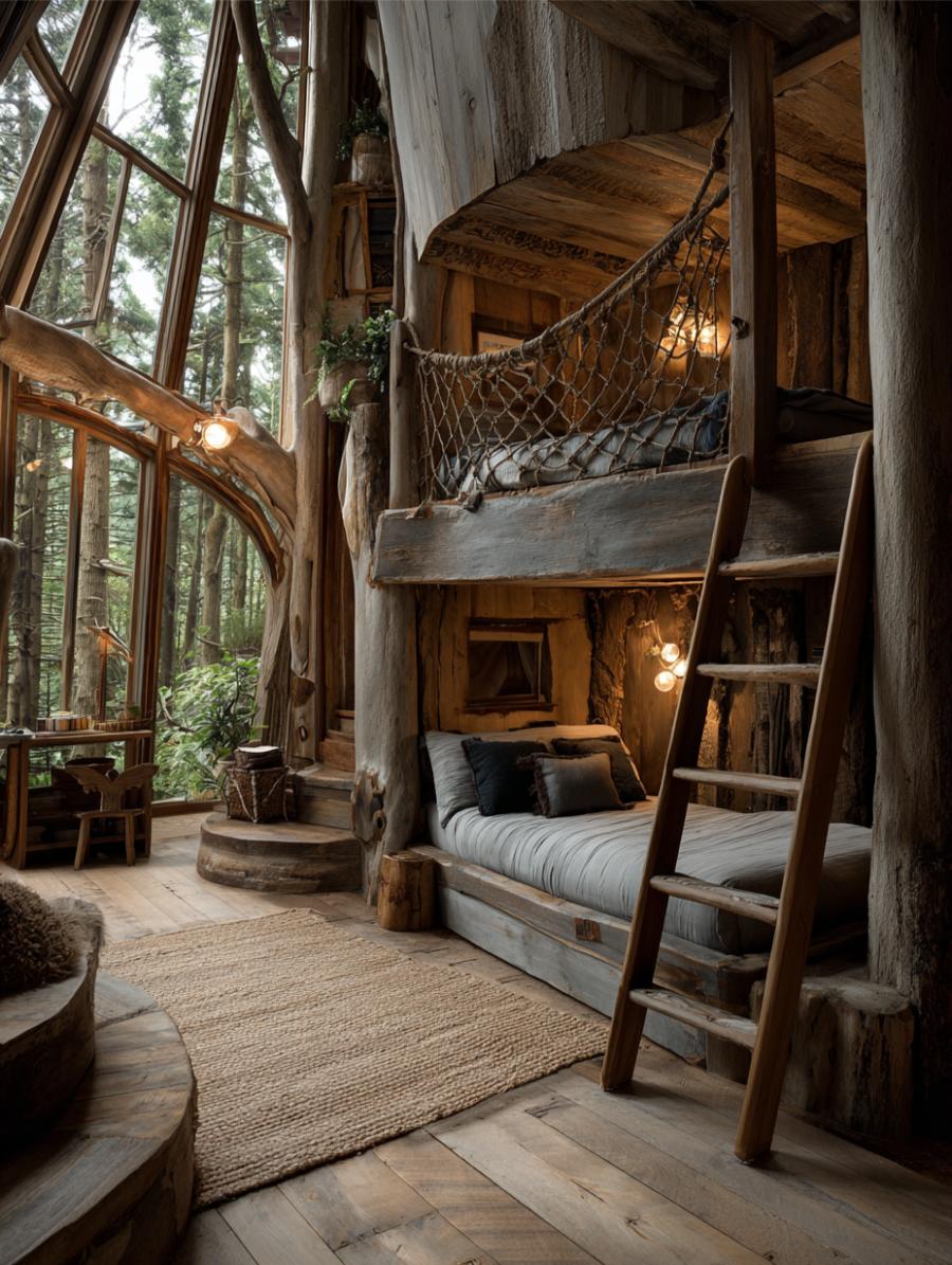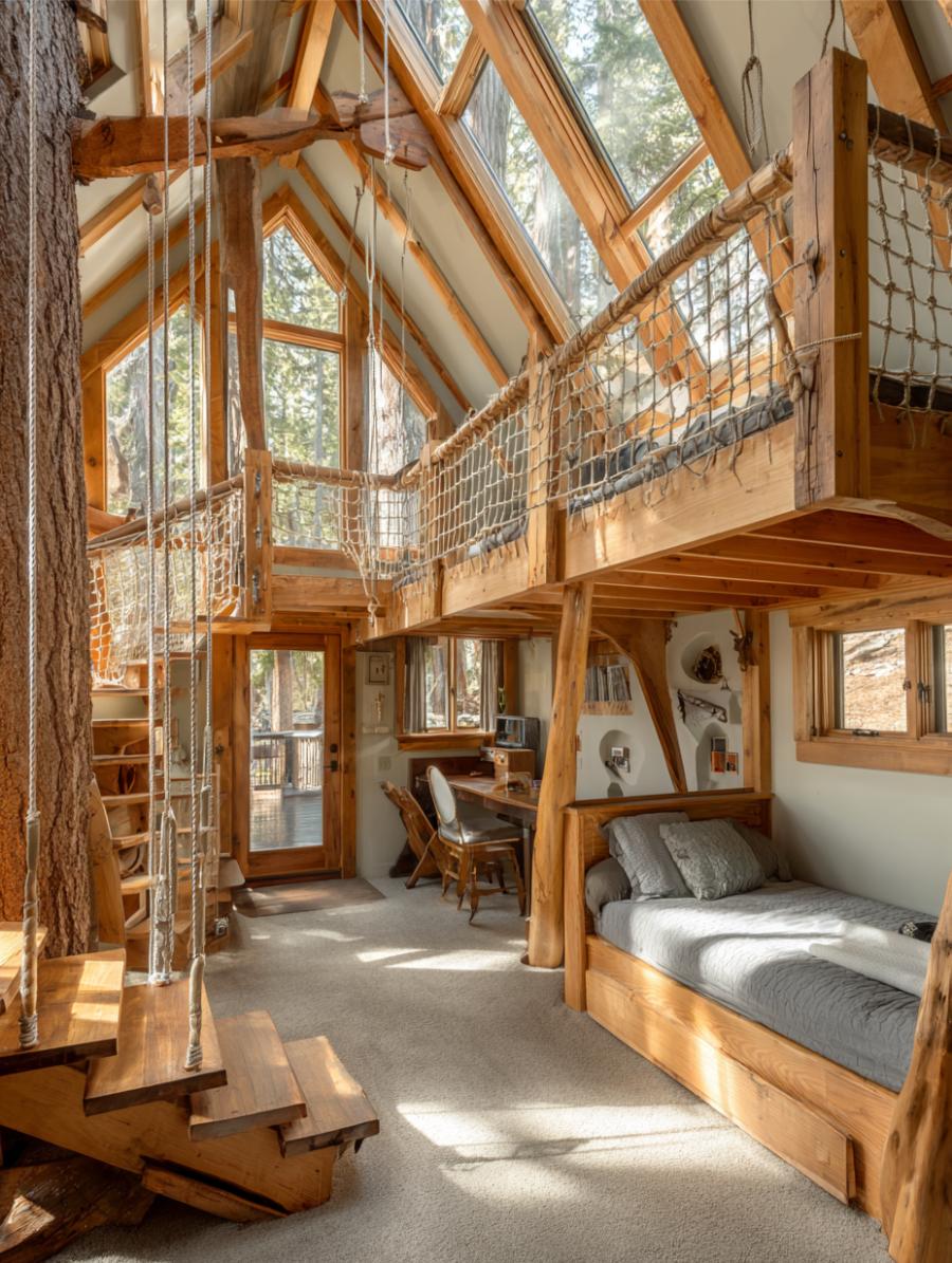 This family loft shows off bunk beds tucked under skylights, creating a sleep space that feels close to the stars. Rope railings and exposed framing intensify the treehouse atmosphere, like a perch built by expert hands. The layout keeps circulation open while packing in multiple beds. It is an ideal zone for cousins, sleepovers, and kids who want to camp indoors above the forest.