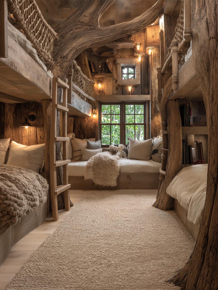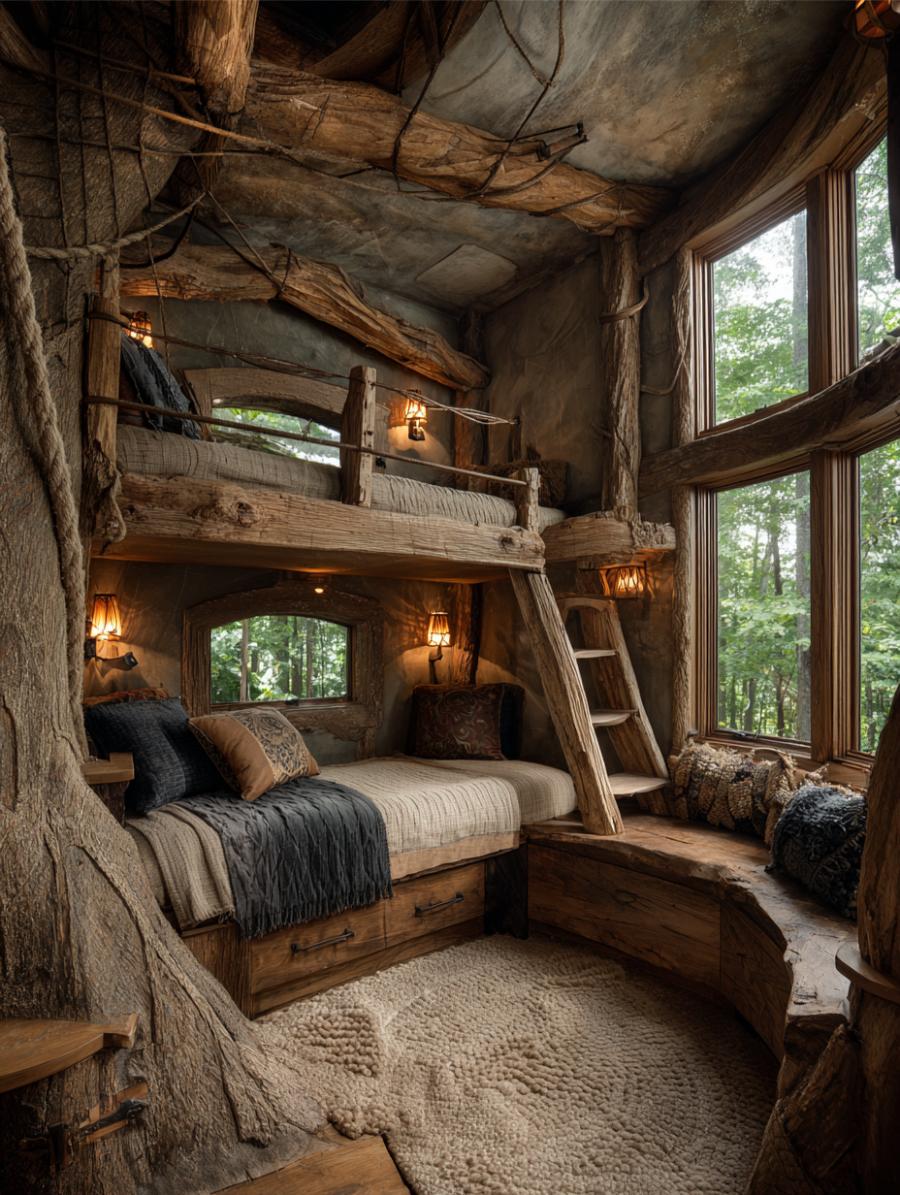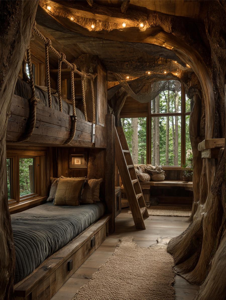 This family loft shows off bunk beds tucked under skylights, creating a sleep space that feels close to the stars. Rope railings and exposed framing intensify the treehouse atmosphere, like a perch built by expert hands. The layout keeps circulation open while packing in multiple beds. It is an ideal zone for cousins, sleepovers, and kids who want to camp indoors above the forest.