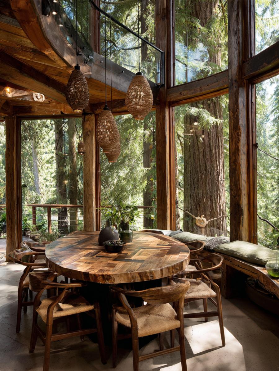 This treehouse dining room trades a long table for a circular reclaimed wood centerpiece. The round shape encourages conversation and eye contact, perfect for intimate meals and family breakfasts. The tableโs weathered texture echoes branches and trunks outside the windows. Surrounded by glass and natural finishes, it feels like sharing a meal inside a luxurious, elevated forest pavilion.