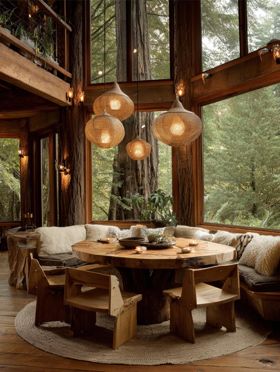 Intimate Treehouse Dining Nook with Reclaimed Round Table