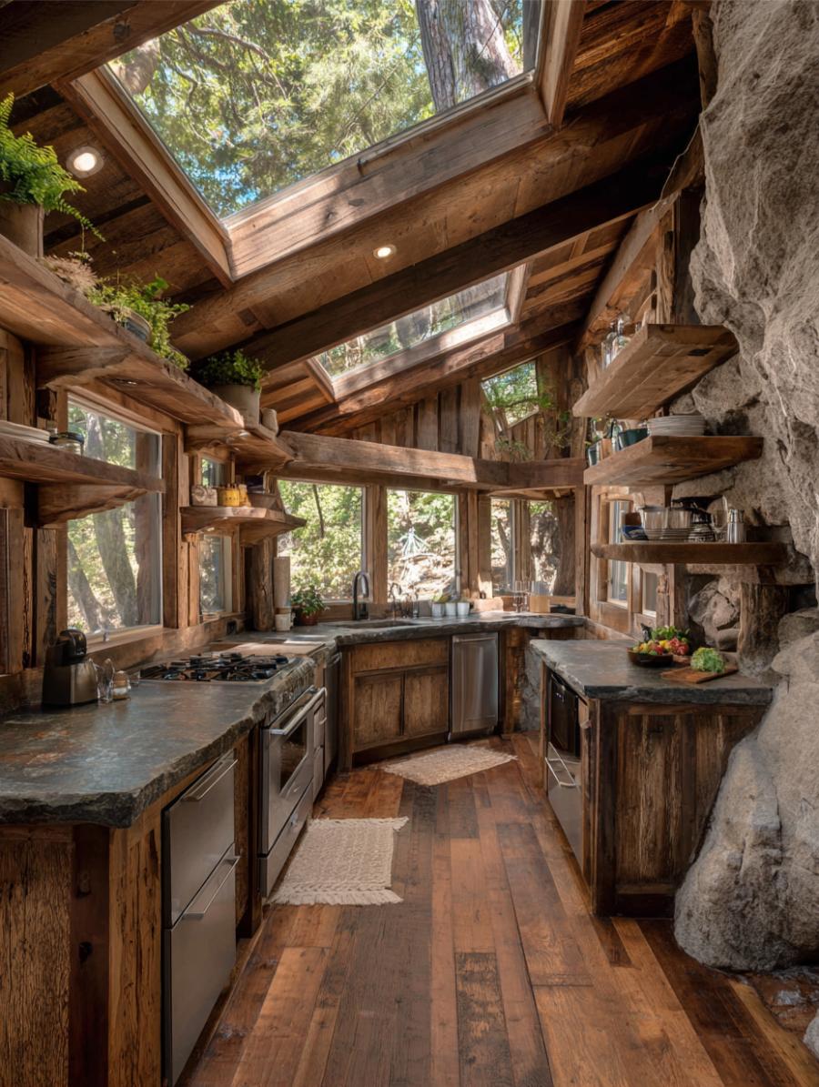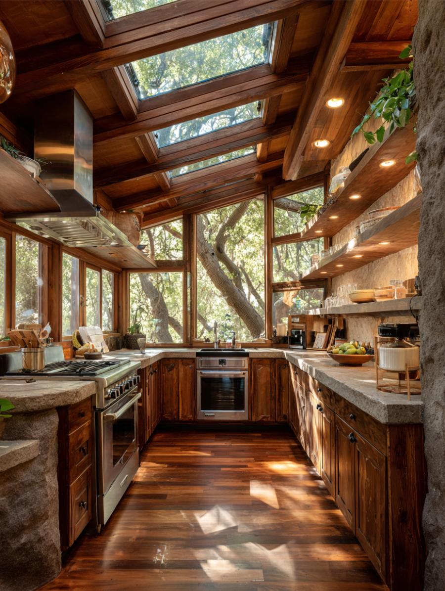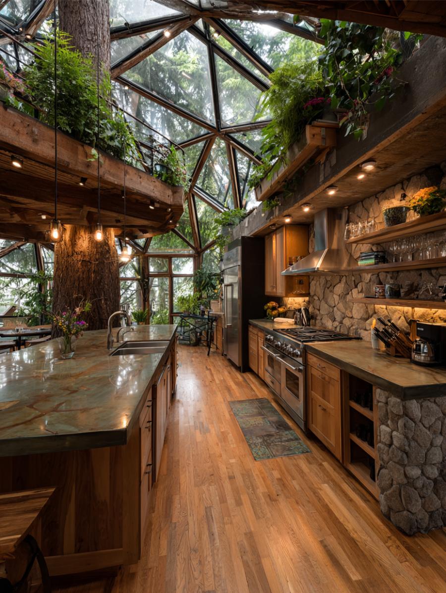 This dramatic treehouse kitchen sits beneath a massive treetop skylight that floods the room with vertical light. Hanging fixtures drop from above, creating a layered composition of beams, glass, and pendants. The result is a kitchen that feels open to sky and canopy while still fully sheltered. It is a stunning place to cook, gather, and watch shifting daylight cross the space.
