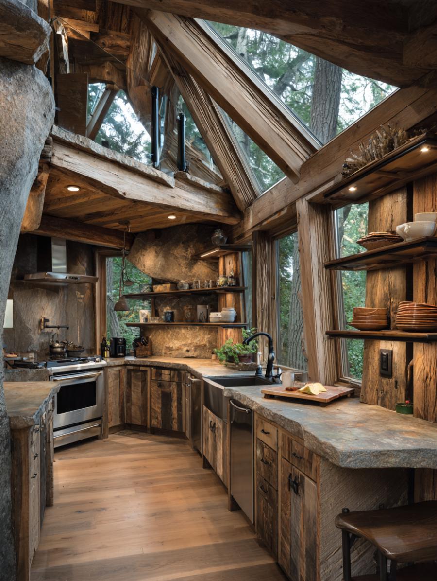This open-plan treehouse space blends kitchen and dining around a dramatic stone island. The island reads like a boulder anchored inside the room, grounding all the wood and glass around it. Bar seating and nearby dining create multiple spots to gather. With treetop views just beyond, the space feels like a mountain lodge kitchen suspended halfway between earth and sky.