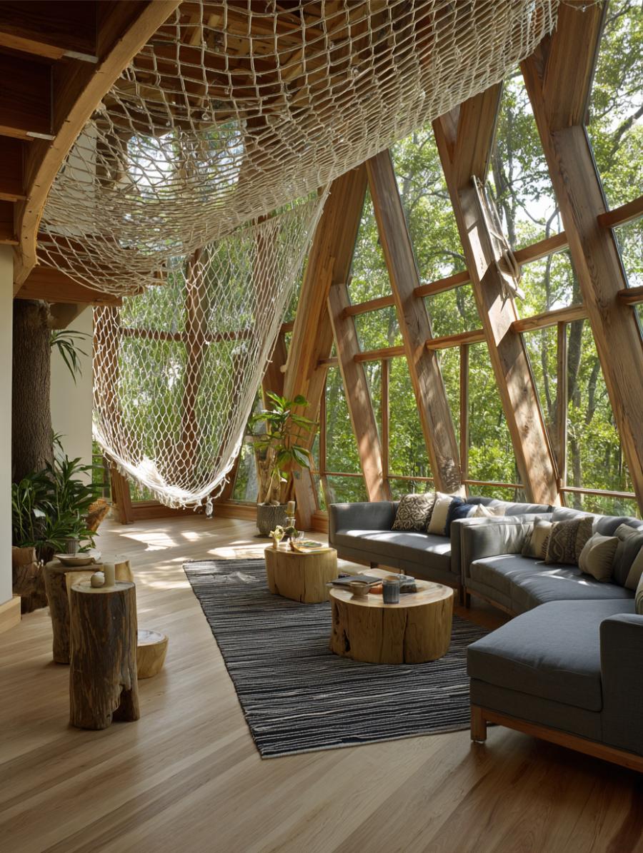 This family lounge might be the most playful space in the treehouse, thanks to suspended hammock nets over open voids. These nets create lounging zones where you can literally float above lower levels. Surrounding seating and railings keep the room functional for everyday use. It feels like a cross between a living room and an adventure park, all wrapped in warm wood and treetop views.
