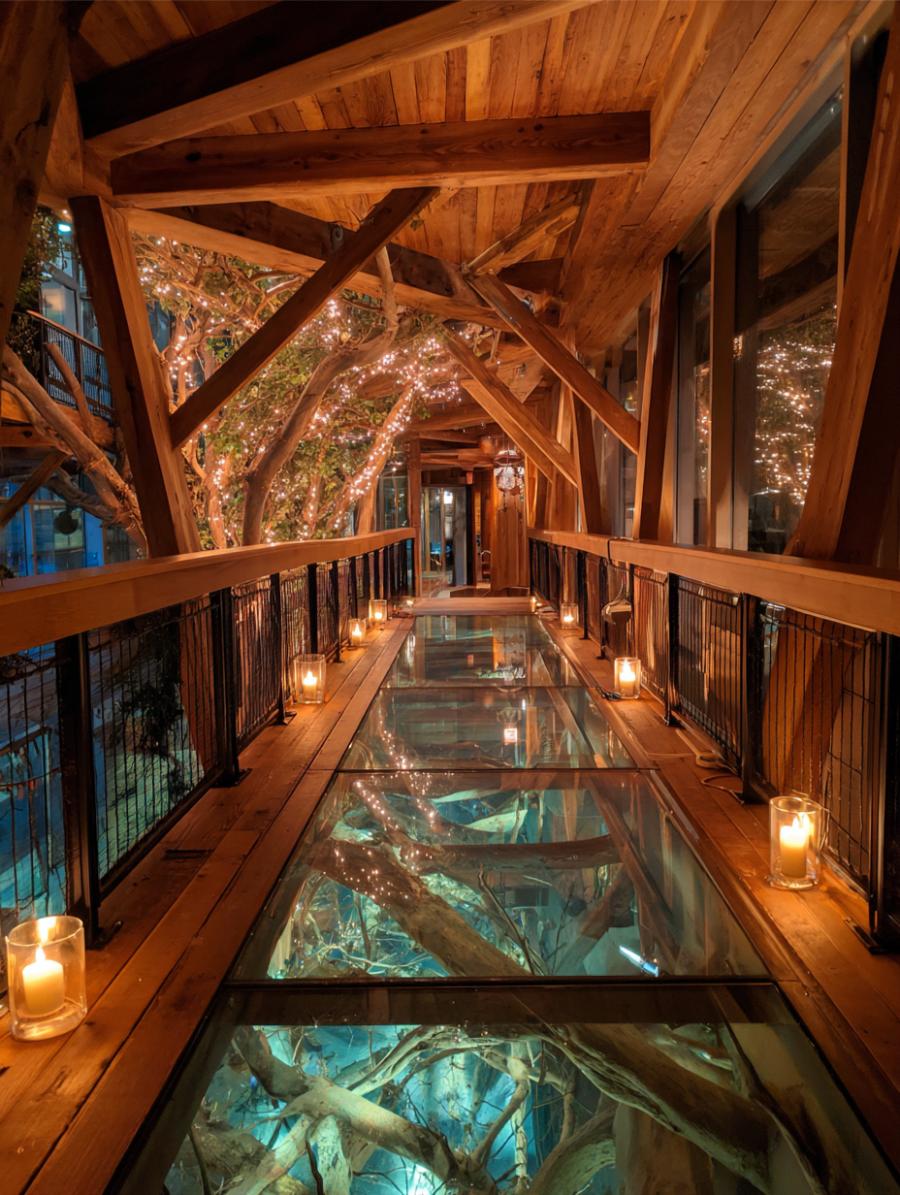 This interior hallway turns a simple circulation route into an experience with glass floor panels. Looking down, you see structure, levels, or perhaps forest elements below, heightening the sense of elevation. Wood framing and solid edges keep the walkway feeling secure while still thrilling. It is a cinematic transition space that reminds you with every step that you are walking in the trees.