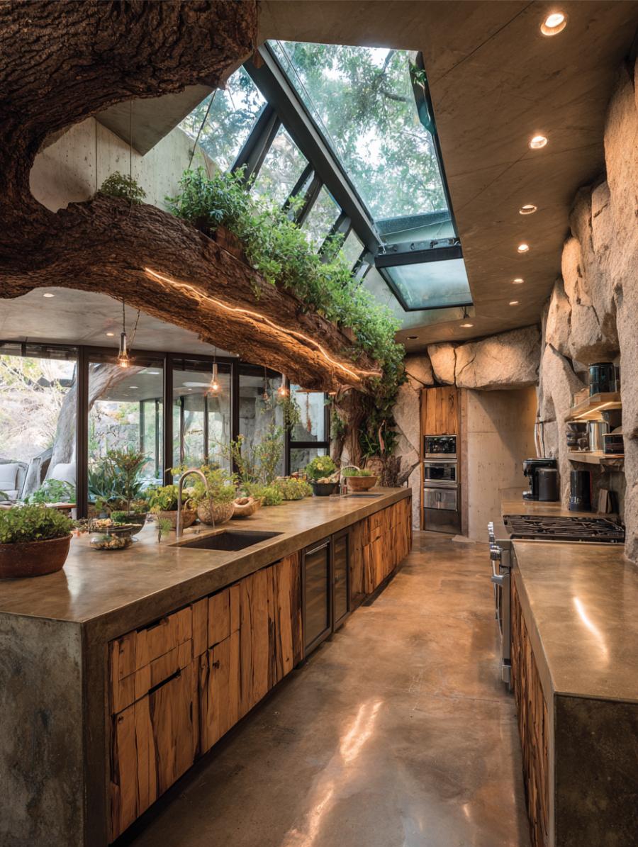 This alternate view emphasizes how the skylight frames treetops like a living ceiling mural. The kitchenโs surfaces catch changing light and shadow throughout the day, making the room feel alive. Hanging fixtures and possible open shelving layer interest overhead. It is a highly theatrical yet functional cooking space, ideal for anyone who loves the idea of literally cooking under the trees.