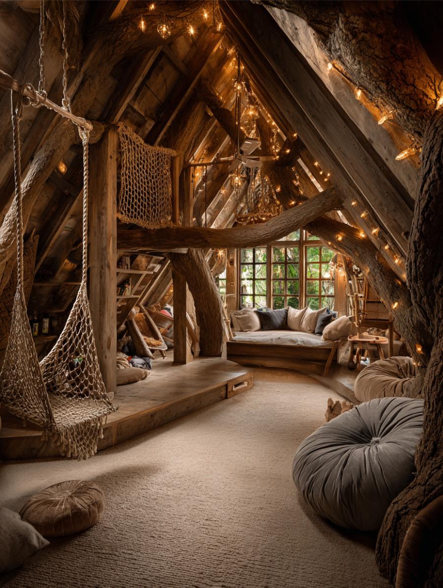 Treehouse Loft Playroom with Rope Swings and Climbing Elements