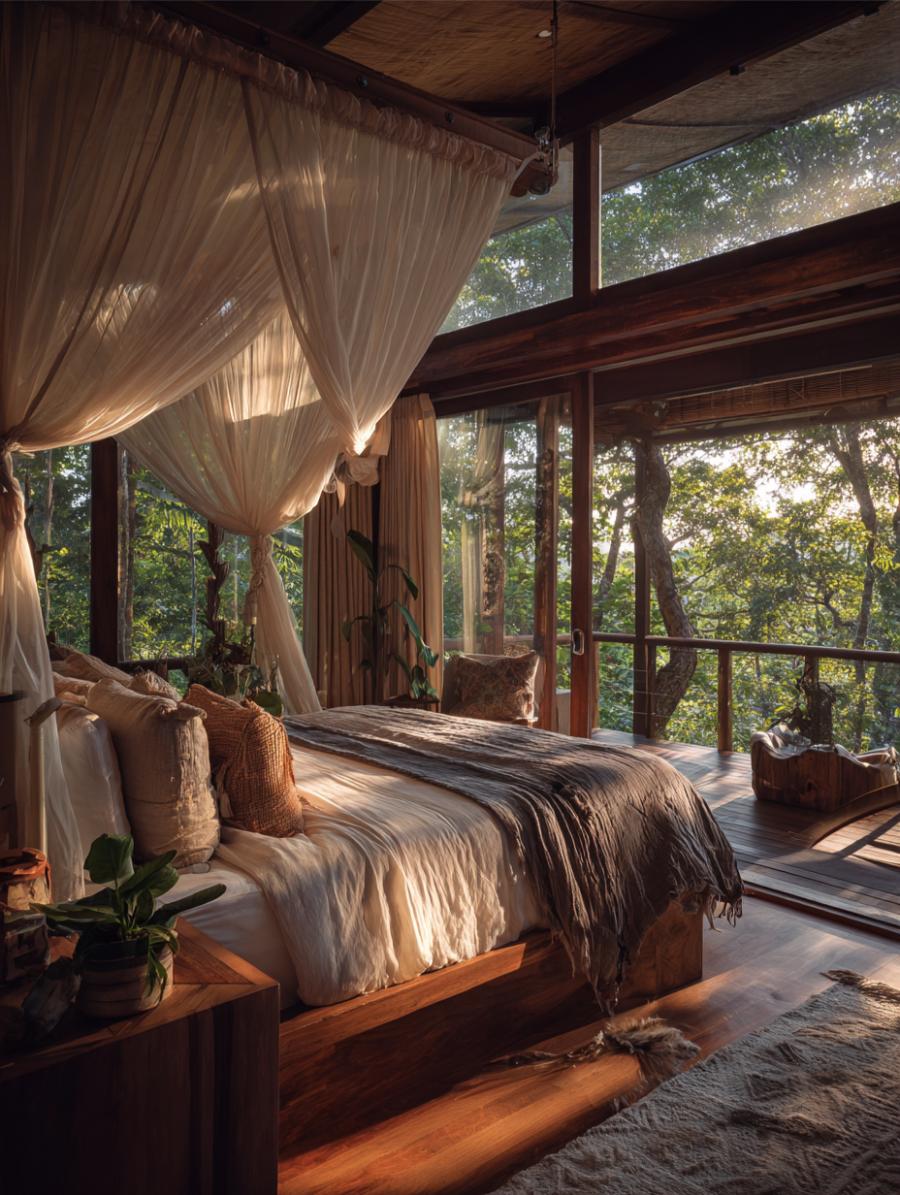 This master bedroom sits high above the forest with a king bed oriented toward expansive views. Large windows or glass doors make waking up feel like emerging directly into the canopy. Wood finishes and soft bedding keep the room warm and restful despite the drama outside. It is a serene retreat that feels both luxurious and intimately connected to nature.