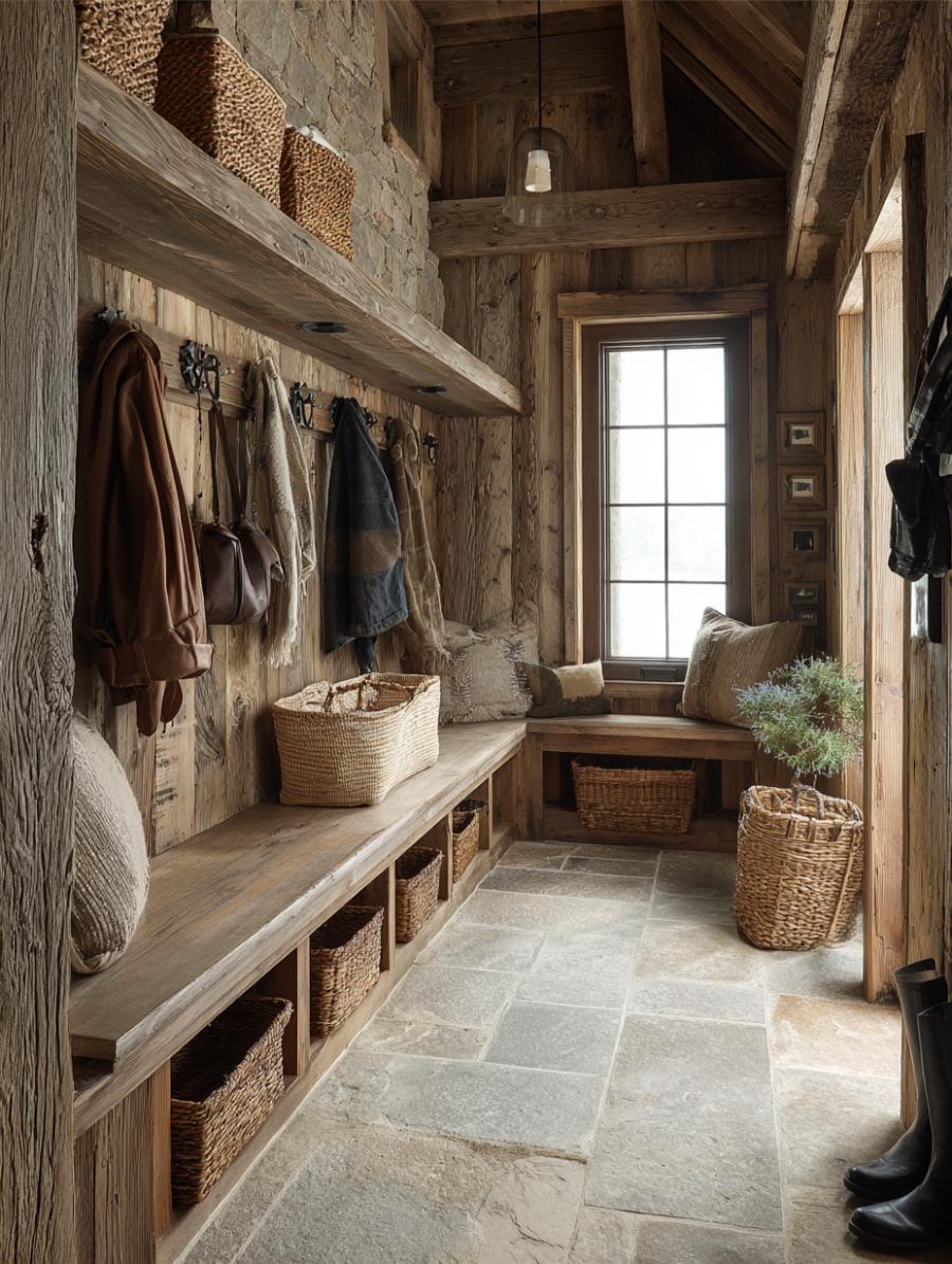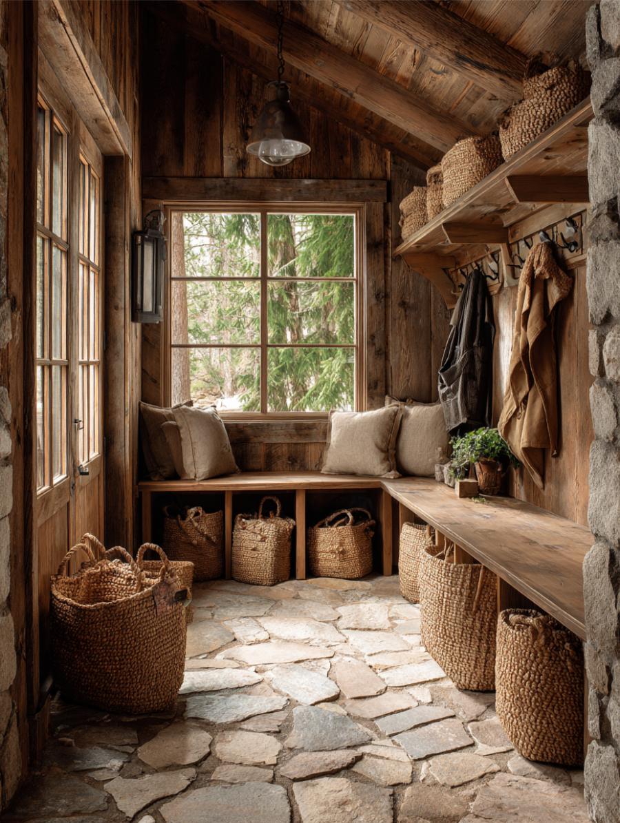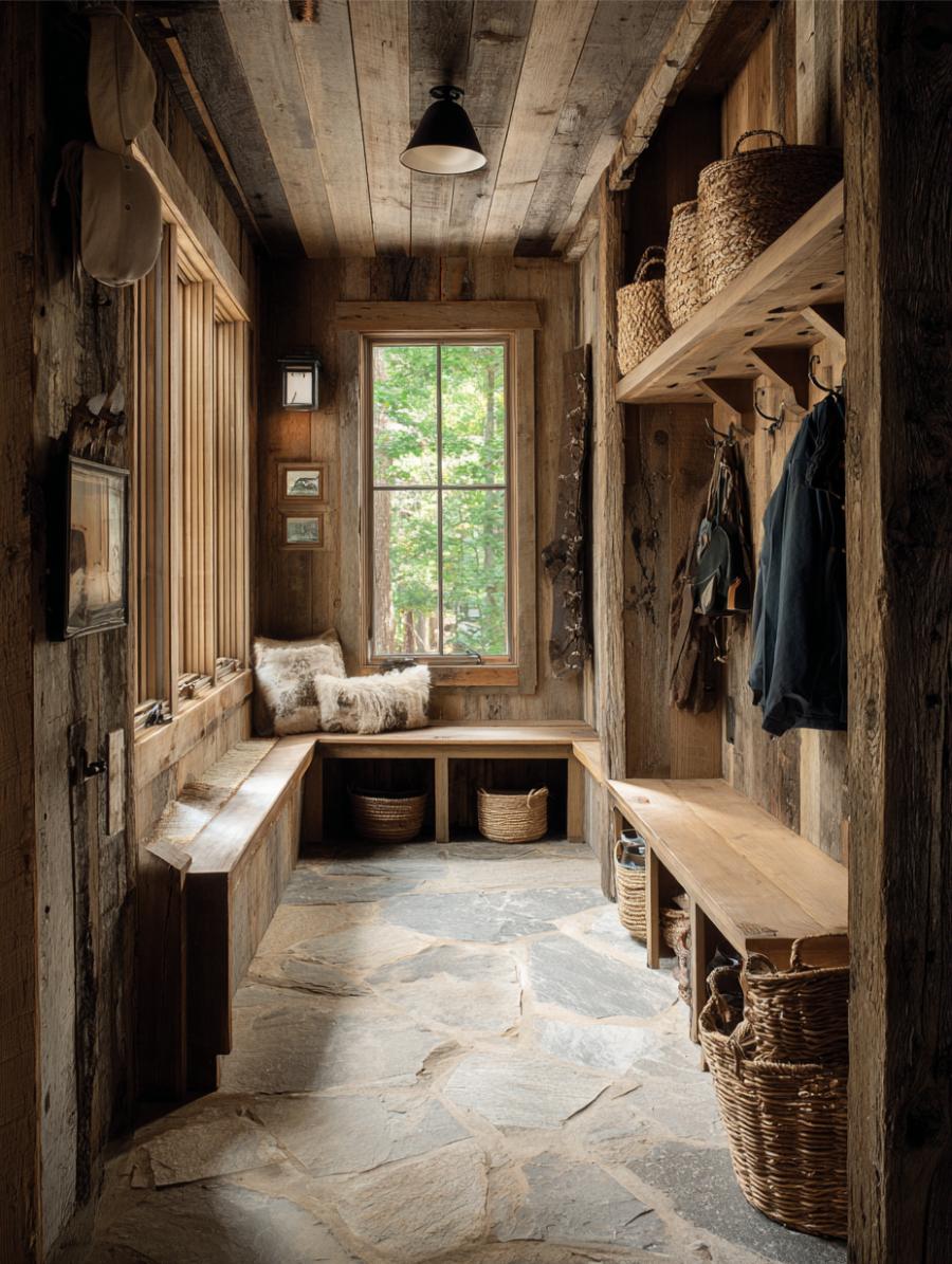 This angle emphasizes open cubbies and bench seating that make it easy to gear up or wind down. The structure likely frames glimpses to the outdoors, reinforcing the sense that you are entering from the woods rather than a street. Durable surfaces are ready for mud and weather. It is a grounded, functional buffer between the wild outside and the cozy interior.