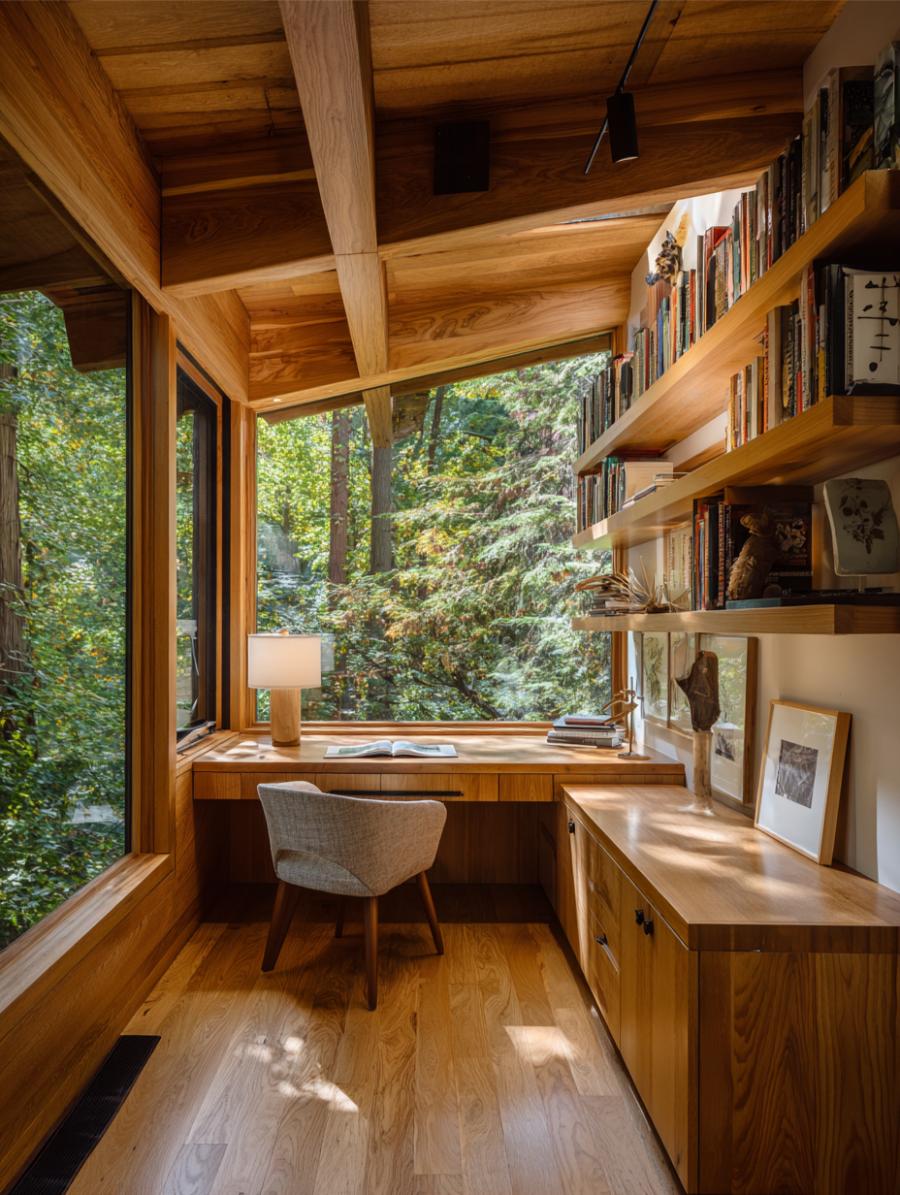 This view of the study nook highlights how the built-in desk, shelves, and window framing all work together. Storage is close at hand without overwhelming the small room. The desk surface becomes a quiet perch where you can concentrate while still feeling the presence of trees and light. It is a hardworking corner that captures the magic of a treetop studio.