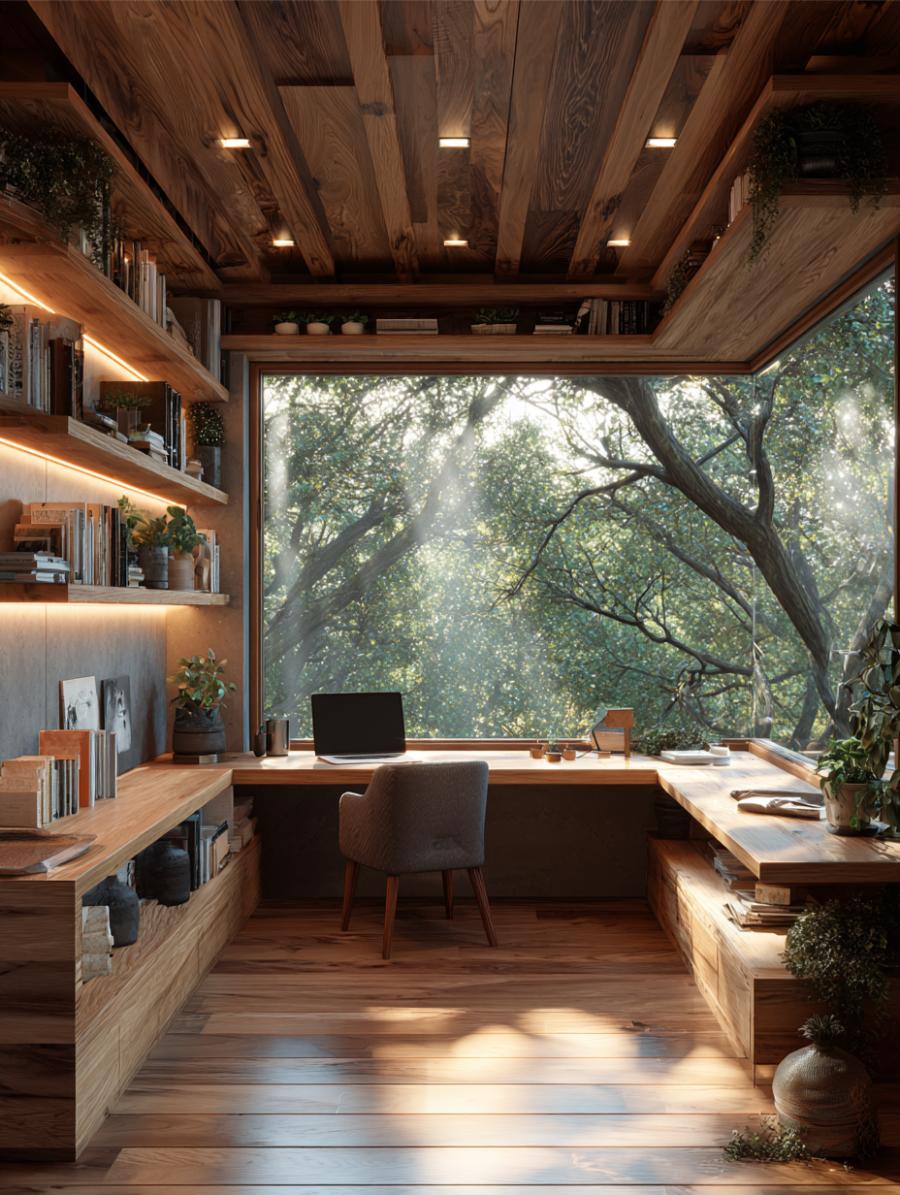Compact Treehouse Study with Built-In Desk and Canopy Views