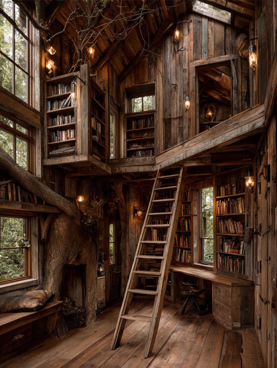 Two-Story Treehouse Library with Ladder-Access Loft Shelves