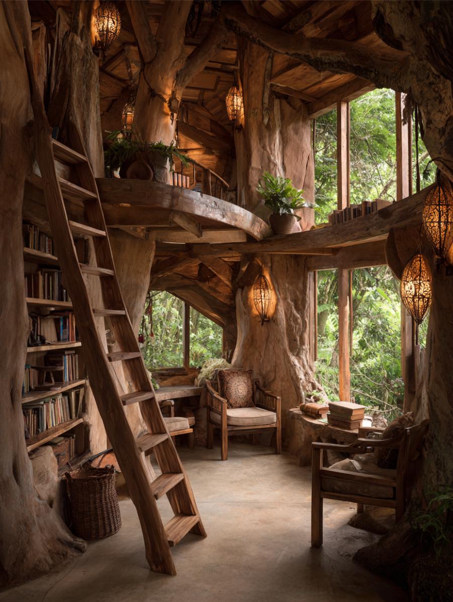 This two-story treehouse library might be the ultimate fantasy for book lovers. Shelves climb the walls, accessible by a ladder that leads to an upper-level loft. The space feels like a secret archive in the canopy, where stories stack as high as the trees outside. Warm lighting and rich wood make the library feel timeless, intimate, and endlessly inviting.