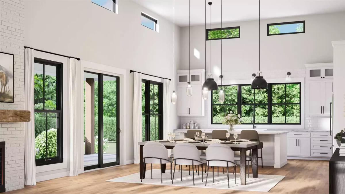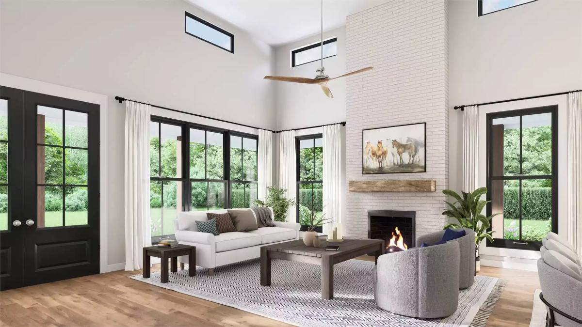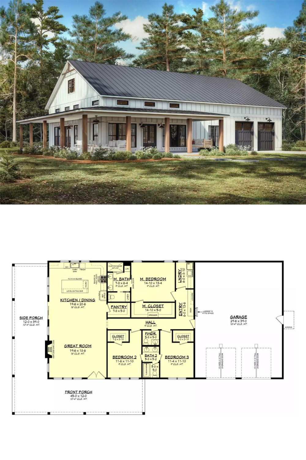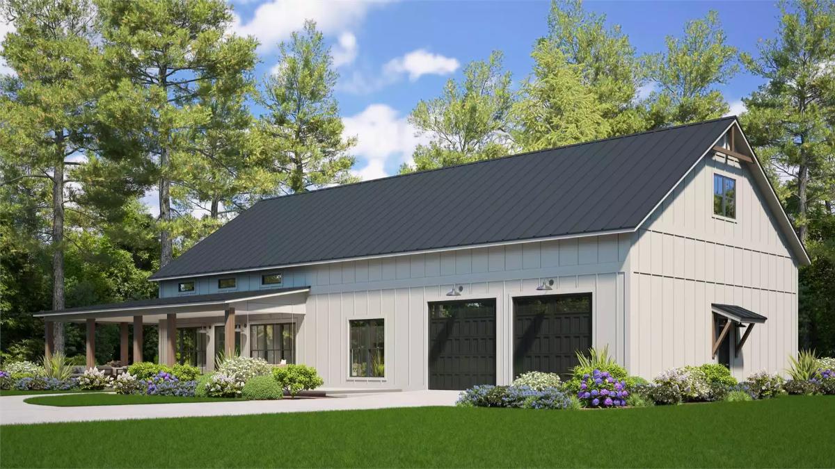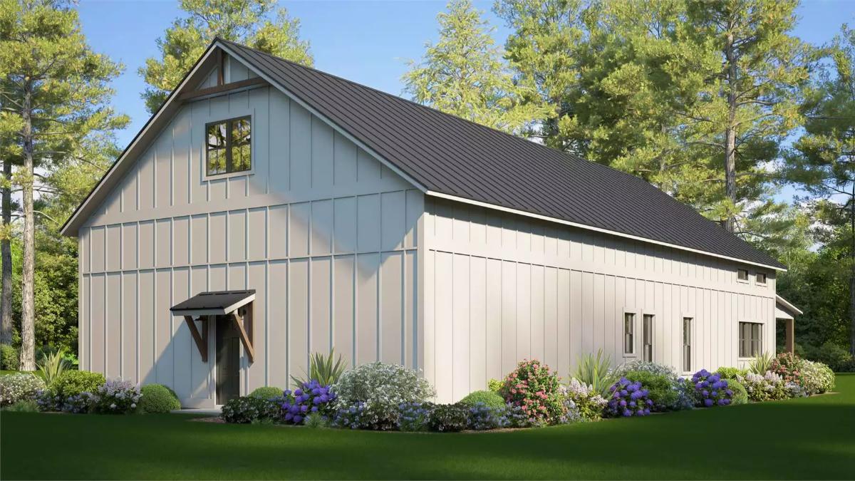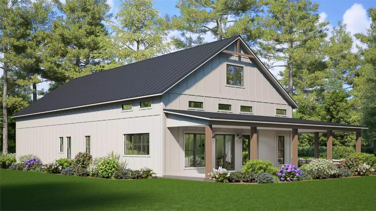 Welcome to this delightful Barndominium design, where incredible spaces for entertaining meet practical and stylish living. This charming 2,000 square foot home features three bedrooms, each equipped with walk-in closets and private baths, ensuring comfort and privacy for all. Additionally, thereโs an extra half bath for added convenience.