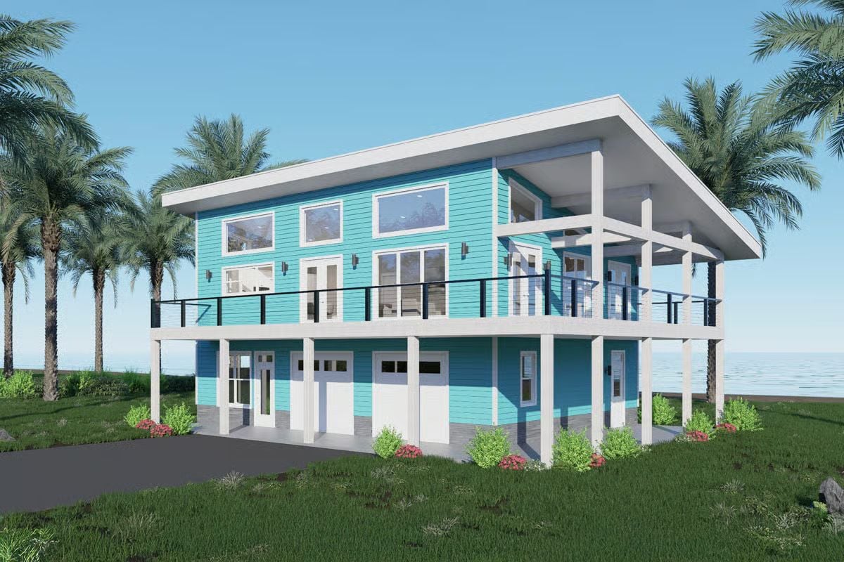 This modern coastal home features a raised design with clean lines and wide outdoor spaces that support relaxed, everyday living. The exterior feels open and contemporary, with an elevated main level and covered areas below that separate living spaces from parking and utility zones.