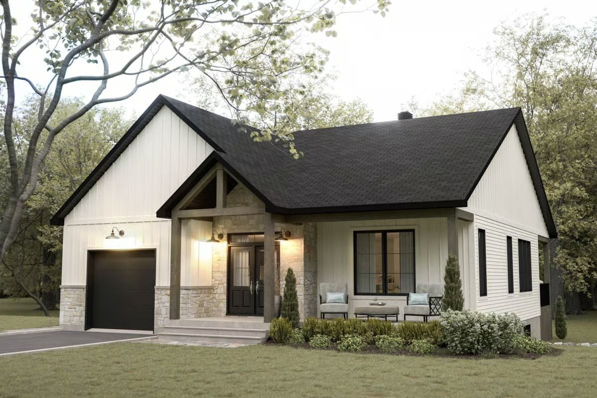 This modern cottage features a balanced mix of light vertical siding and natural stone accents that add warmth and texture to the faรงade. A dark gable roof contrasts elegantly against the light walls, emphasizing the homeโs simple, refined lines. The front porch, supported by sturdy wooden beams, provides a welcoming entryway with space for seating and relaxation.