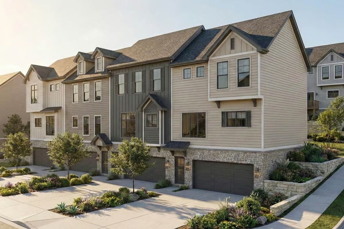 This modern Craftsman townhome design delivers a clean, upscale look with a mix of horizontal siding, board-and-batten accents, and a strong roofline that gives the exterior depth and character. The front-facing garage keeps the streetscape tidy and practical, while the tall windows bring in natural light and help the home feel open across all three levels.