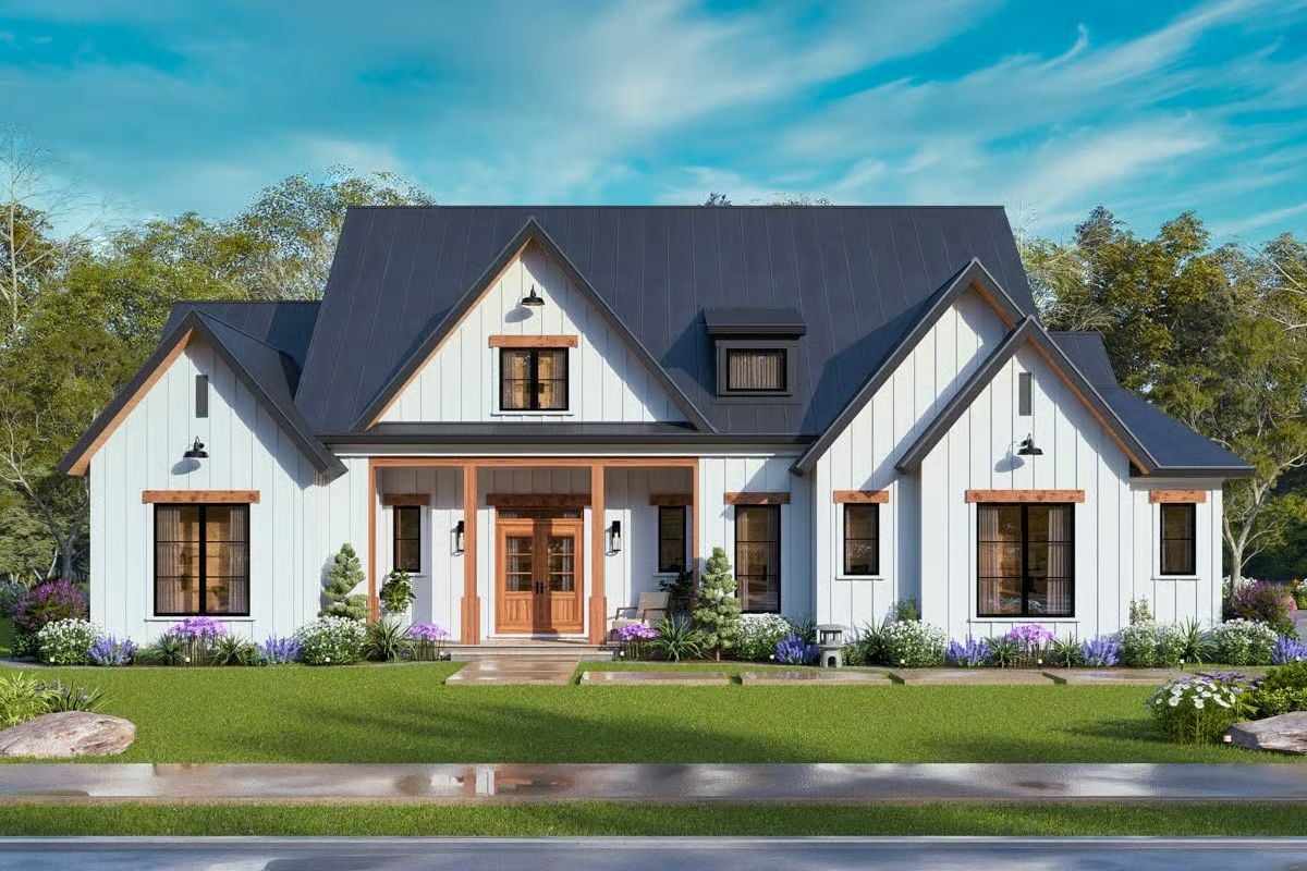 This modern farmhouse design combines a clean, welcoming exterior with a layout that keeps everyday living open and efficient while still offering separation where it matters. The main level is centered around a large great room that flows into the kitchen and breakfast area, creating a connected space for cooking, dining, and relaxing without feeling crowded.