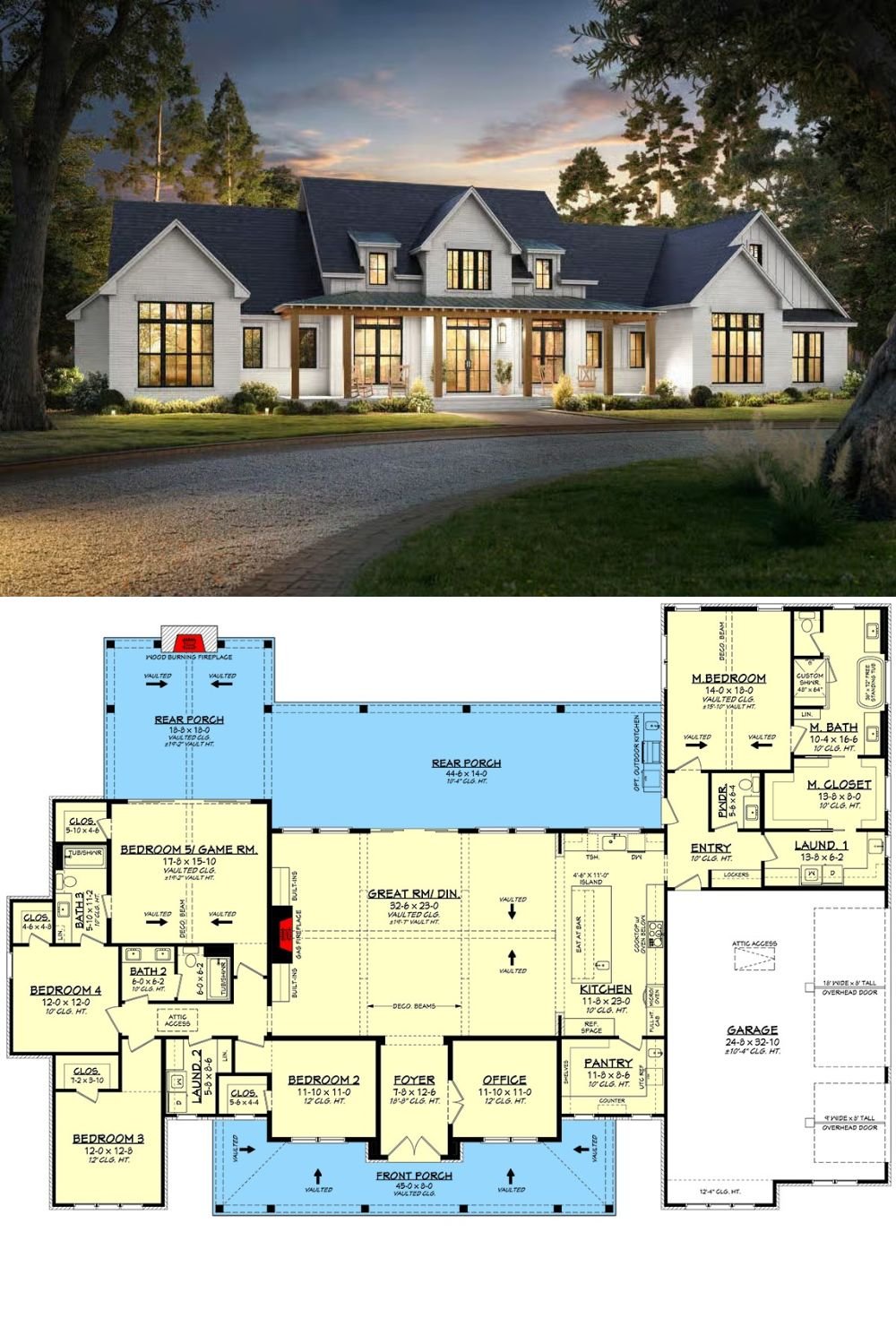 The primary suite is a private retreat, complete with a vaulted ceiling, a luxurious bathroom with a custom shower and soaking tub, and a spacious walk-in closet. On the opposite side of the home, several additional bedrooms share well-appointed baths, providing comfort and privacy for family or guests. A versatile room near the rear of the house can serve as a game room or a fifth bedroom, adding flexibility to the design. The home also includes a dedicated office, a mudroom with built-in lockers, and a large garage with additional storage space.