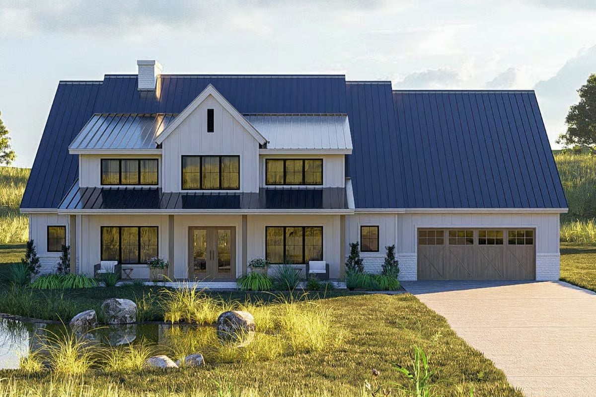 This modern farmhouse design presents a balanced exterior with a strong roofline and a wide front porch that anchors the homeโs overall profile. The layout is single-level, keeping all primary living spaces easily accessible while maintaining clear separation between shared areas and private rooms.