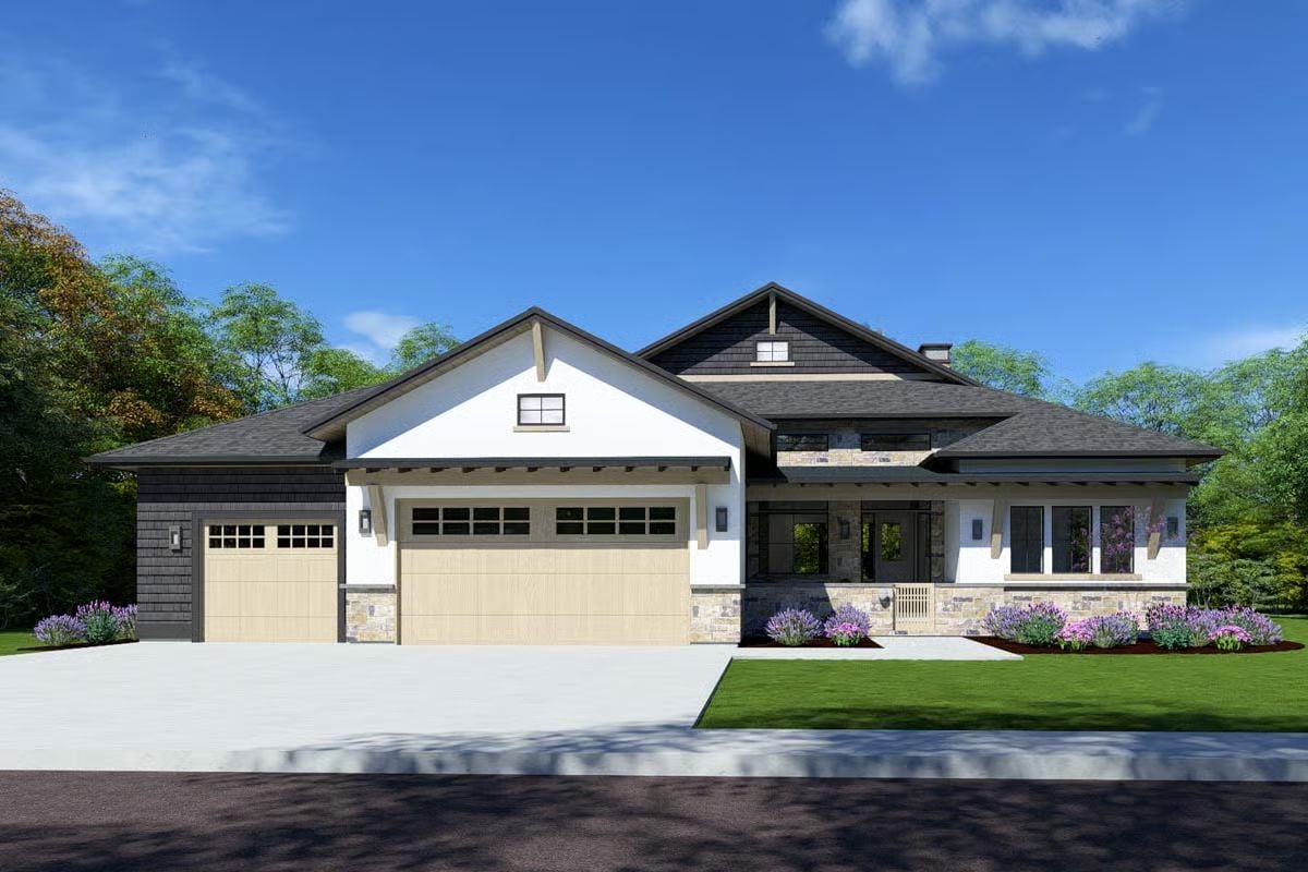 This modern farmhouse features a striking combination of traditional and contemporary design elements. The exterior presents a well-balanced mix of clean white siding, dark roofing, and natural stone accents, with large windows that allow ample natural light to fill the interior.