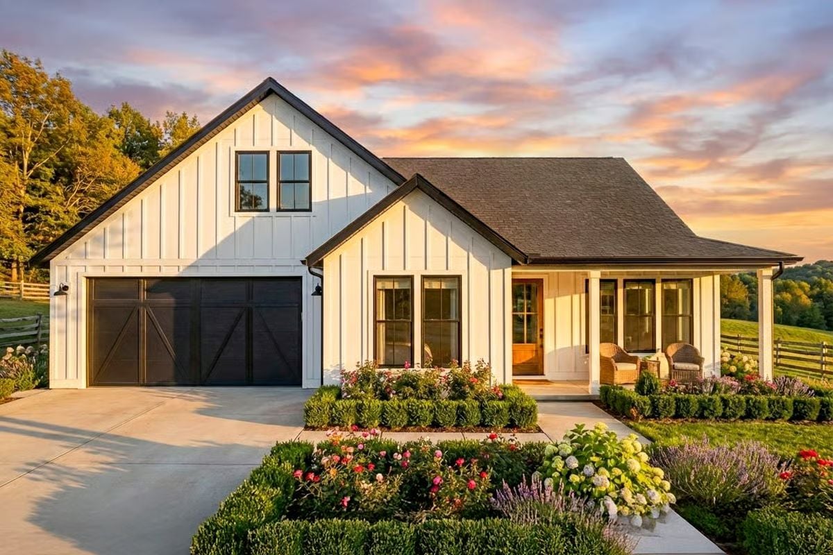 This modern farmhouse home features crisp vertical siding, clean gabled rooflines, and a welcoming covered front porch that gives the exterior a balanced, contemporary look. Dark window accents and a streamlined garage door add contrast while keeping the overall design simple and refined.