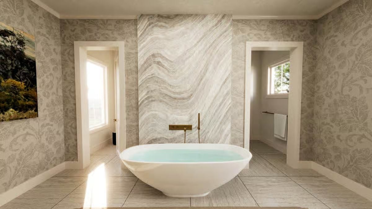 The primary suite is tucked away for privacy, featuring a vaulted ceiling, dual walk-in closets, and a luxurious bathroom with both a soaking tub and a walk-in shower. Additional conveniences on this level include a large laundry room, a half bath, and a three-car garage connected through a mud-friendly hallway.