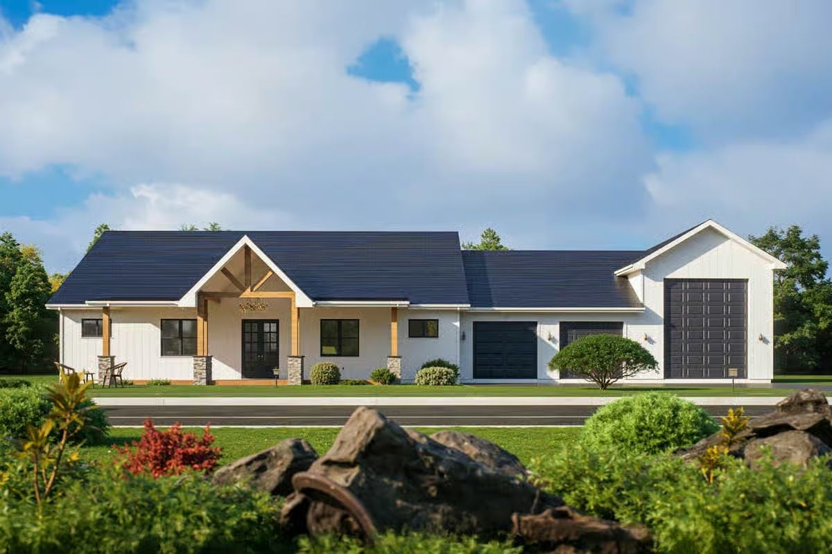This modern farmhouse presents a clean, expansive silhouette with a strong sense of balance and everyday livability. The covered front porch anchors the faรงade, offering a welcoming outdoor space that visually connects the main living areas to the landscape.