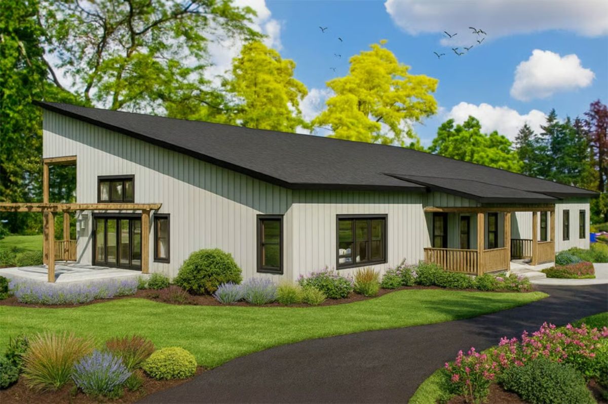 Rendering shows modern farmhouse exterior with vertical siding and dark roof above floor plan revealing complete layout.