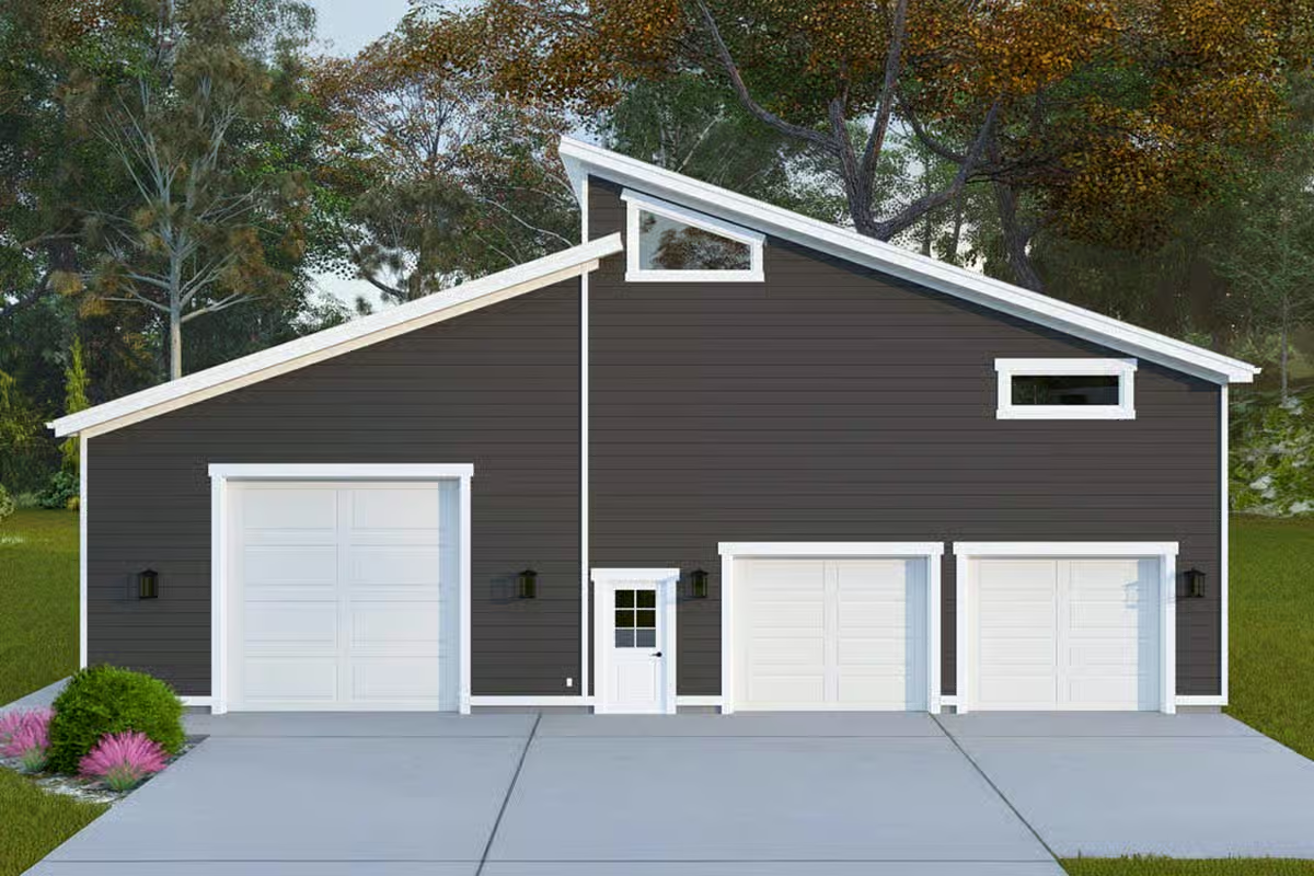 This modern garage structure features a clean, minimalist exterior defined by simple horizontal siding, sharp rooflines, and contrasting trim. The asymmetrical roof design gives the building a contemporary profile while clearly expressing the different interior volumes. Multiple garage doors are integrated seamlessly into the faรงade, reinforcing the structureโs purpose-driven design without unnecessary detail.