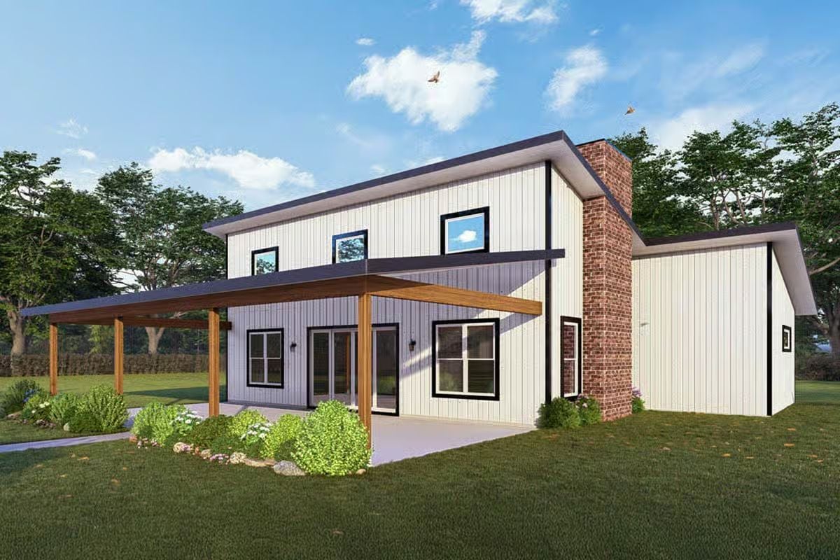 This modern home combines clean lines with a simple, functional form that feels current without being rigid. Vertical siding, a low-profile roofline, and a mix of solid and open elements give the exterior a balanced look, while the covered outdoor area adds usable space and a clear connection between indoors and out.