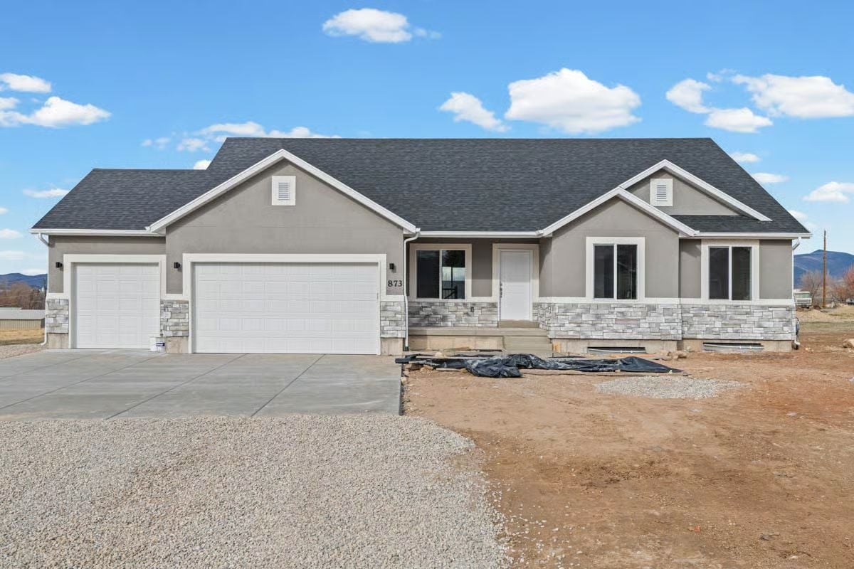 Modern ranch styling shapes the exterior with a long, low profile, clean gabled rooflines, and a straightforward mix of smooth siding and stone accents along the base. The front elevation is balanced and practical, with an attached garage that blends into the overall structure rather than dominating it. Simple trim details and evenly spaced windows keep the look current and understated.