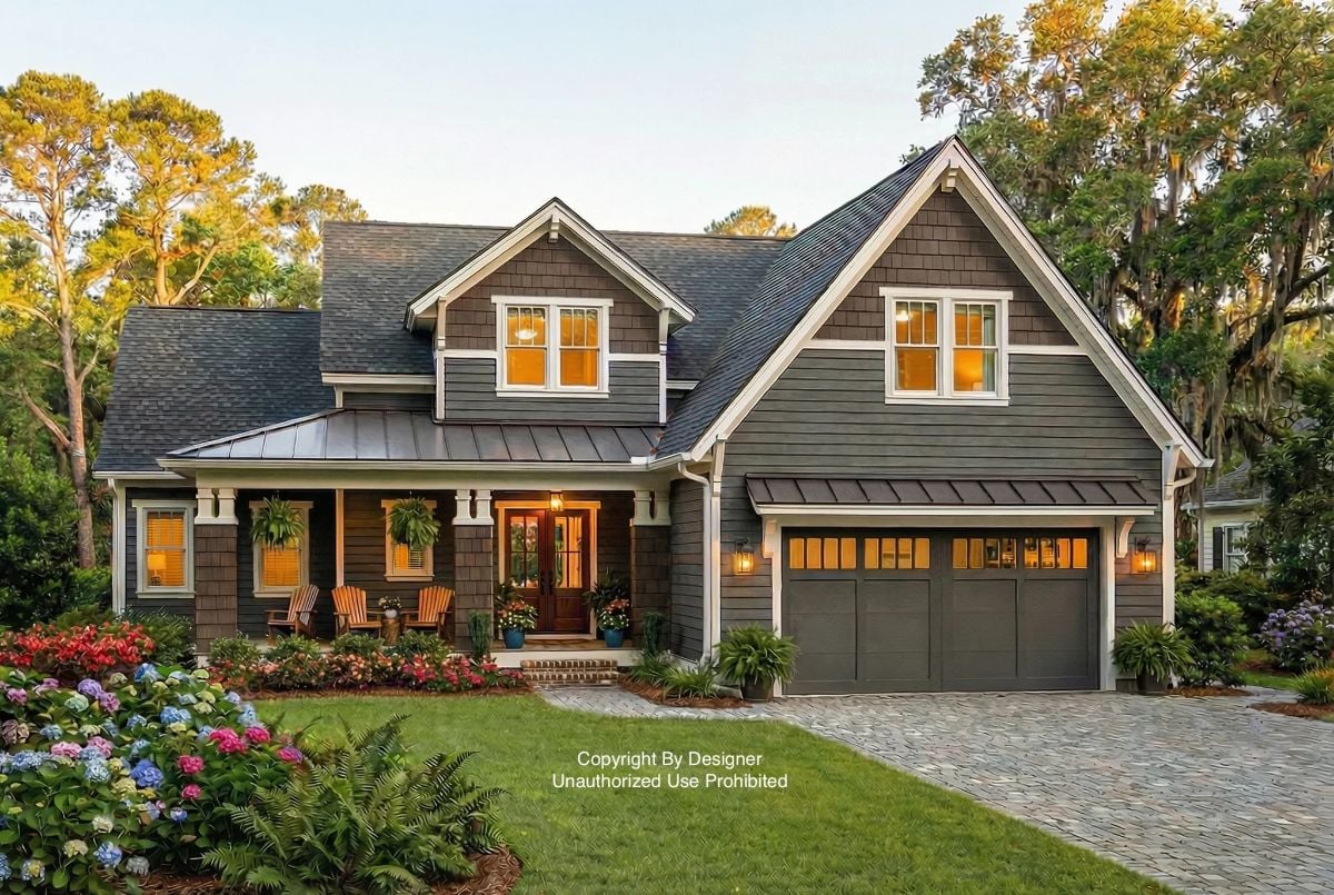 Exterior photo shows a dark gray Craftsman home with dormer windows, a covered front porch, and a two-car garage. Below it, the first-floor plan lays out 1,430 square feet, including a primary suite, great room, kitchen, guest room, mud room, and rear porch across a 50-foot width.