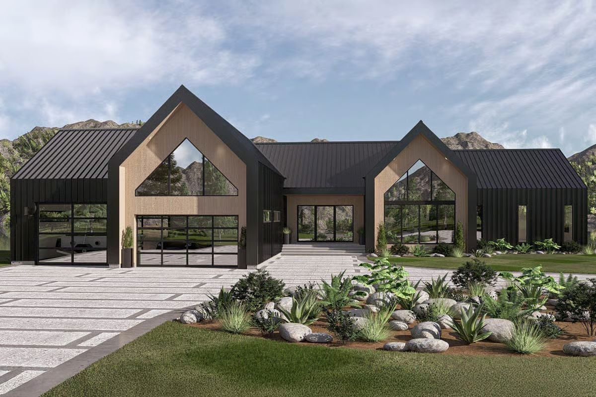 This modern Scandinavian design defines the exterior with bold gabled forms, dark metal roofing, and a clean contrast between wood-toned siding and darker vertical panels. Large window walls are integrated directly into the front-facing gables, giving the home a strong architectural presence while emphasizing light and openness. The entry is centered and understated, framed by simple lines that keep the focus on structure rather than ornament.