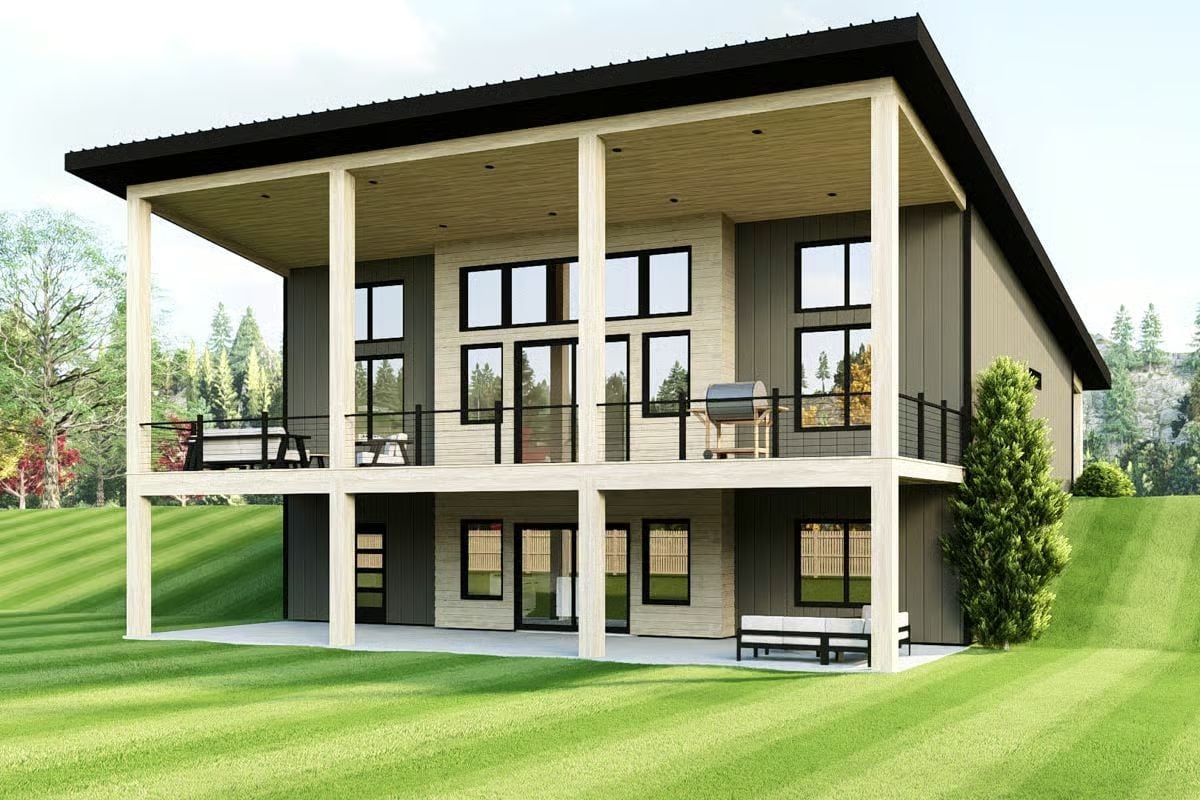 Mini List: Clerestory windows sit above the garage doors, pulling daylight deep into the upper wall without sacrificing privacy. Black-framed fixed windows punctuate the siding at mid-height for ventilation and visual balance. The shed roof pitches away from the entry, directing rainwater efficiently off the structure.
